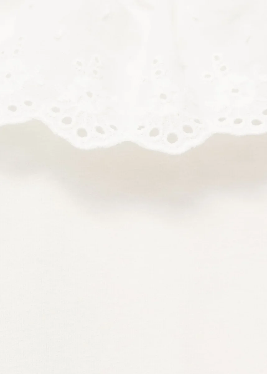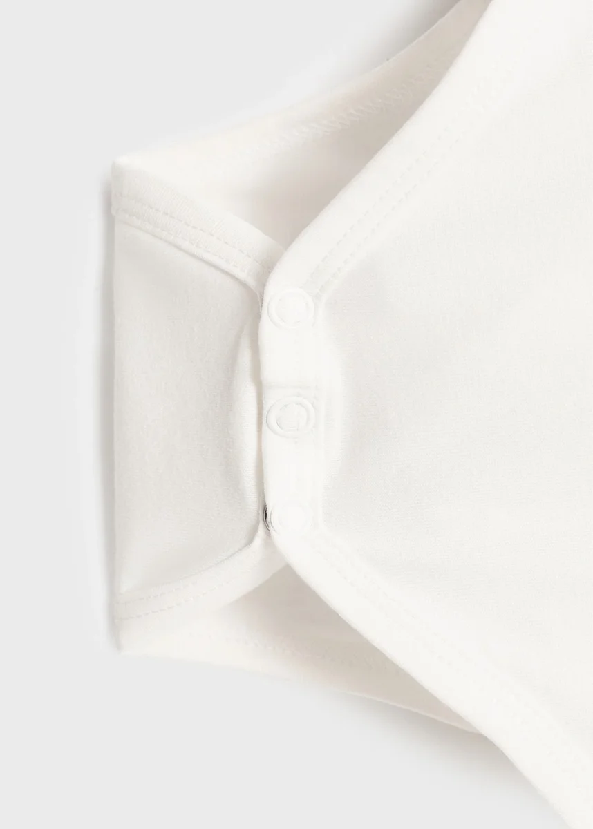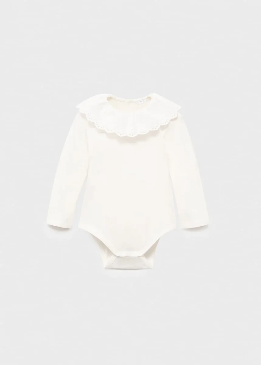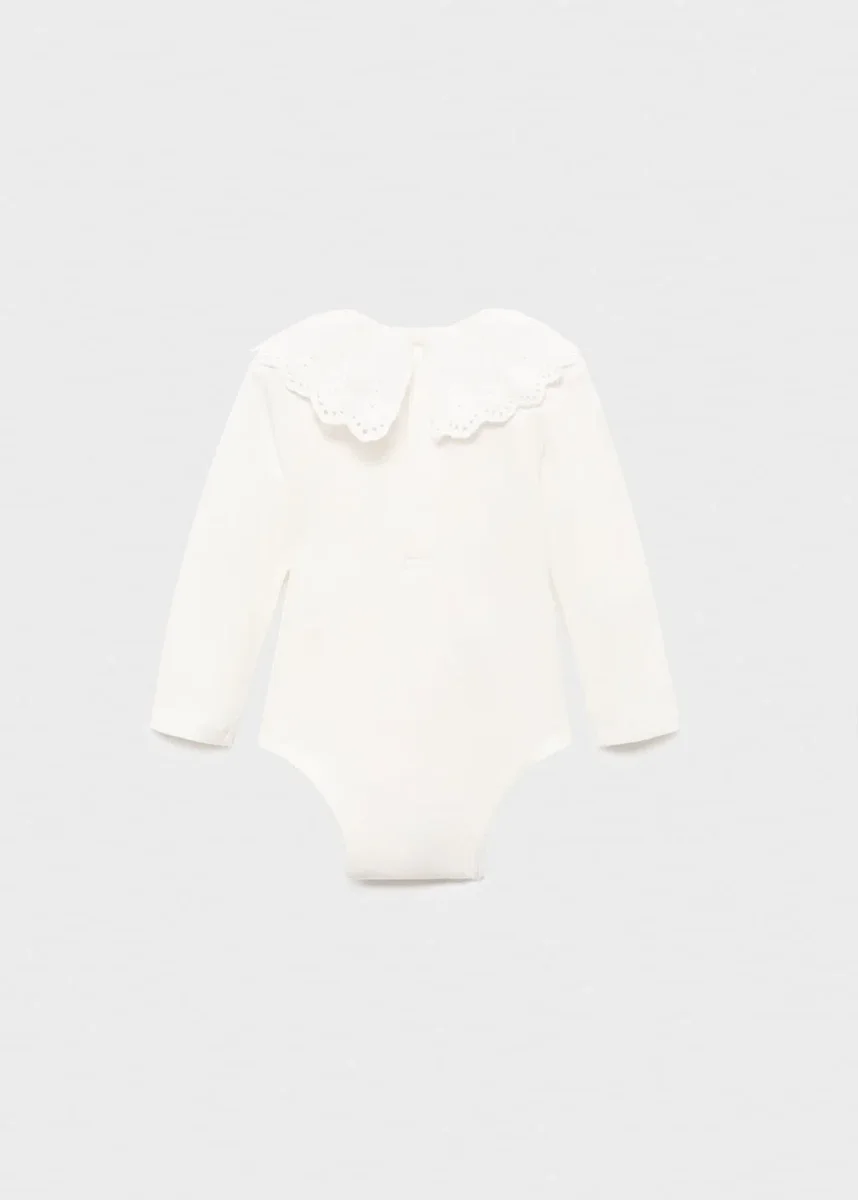 Realizzato in tessuto di cotone elasticizzato, questo body presenta un design dritto con collo babydoll impreziosito da ricami. Include maniche lunghe e chiusure con bottoni a pressione sul retro e sul fondo.