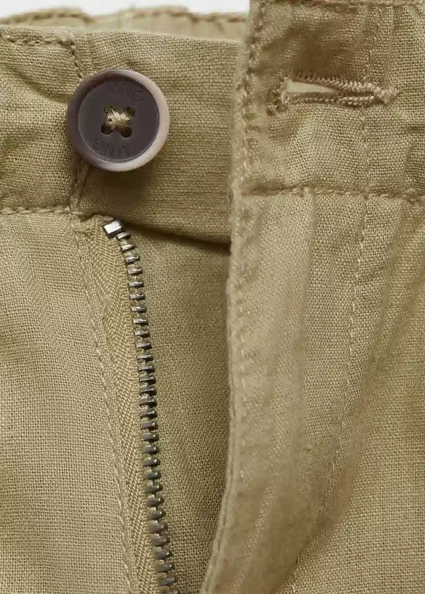 Tessuto di lino. Tessuto di cotone. Modello corto. Modello dritto. Vita elasticizzata. Passanti per cintura. Chiusura con zip e bottone. Due tasche laterali. Tasca posteriore applicata