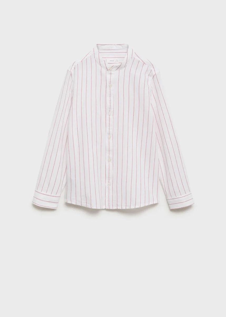 Tessuto con lino. Design a righe. Design dritto. Collo alla coreana. Maniche lunghe. Chiusura con bottoni