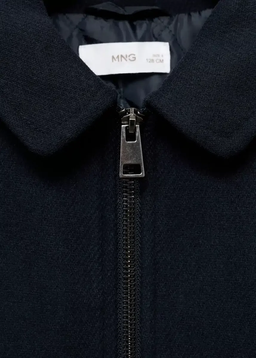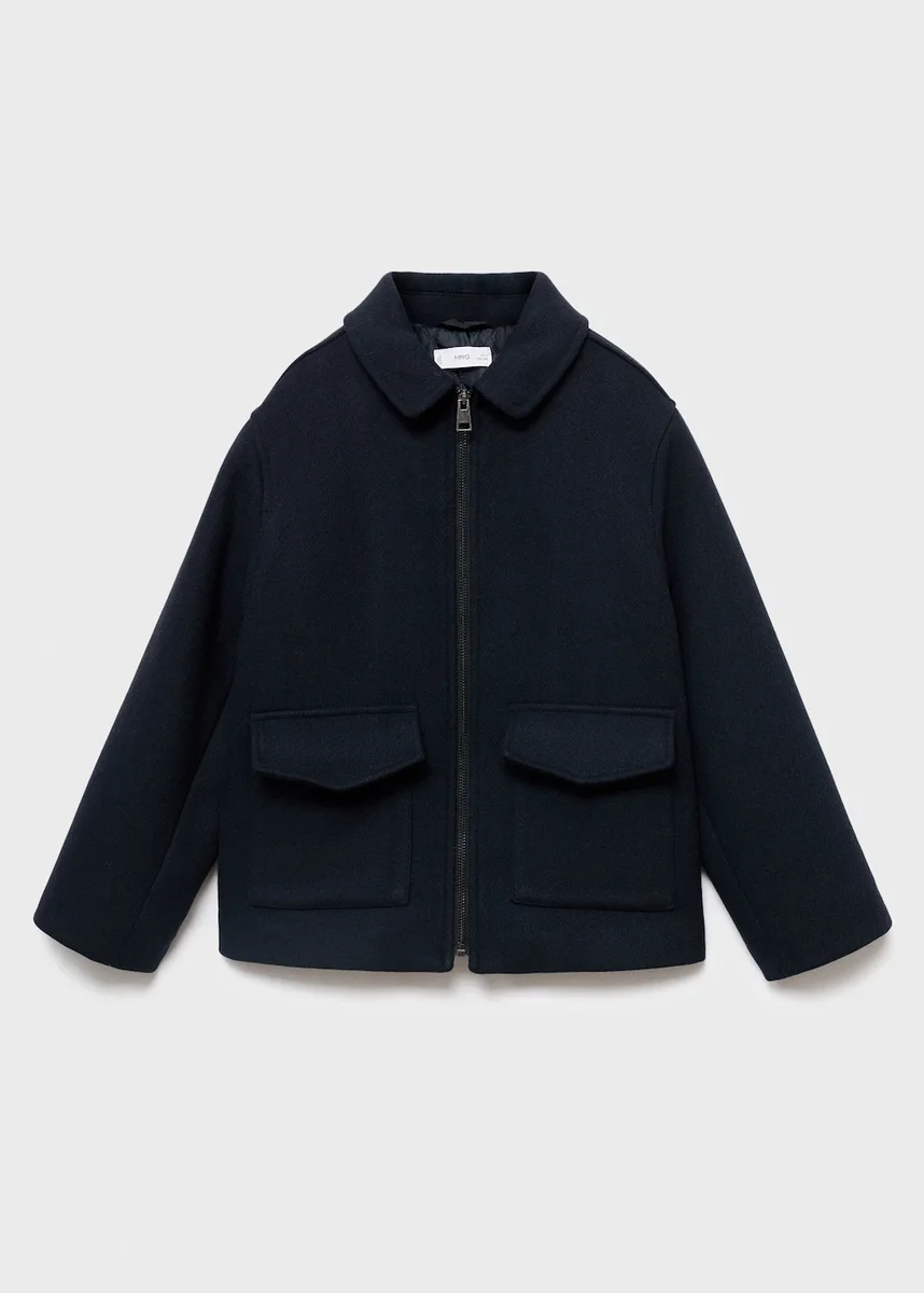Tessuto di lana. Tessuto. Design dritto. Colletto camicia. Maniche lunghe. Chiusura con cerniera. Due tasche applicate sul davanti