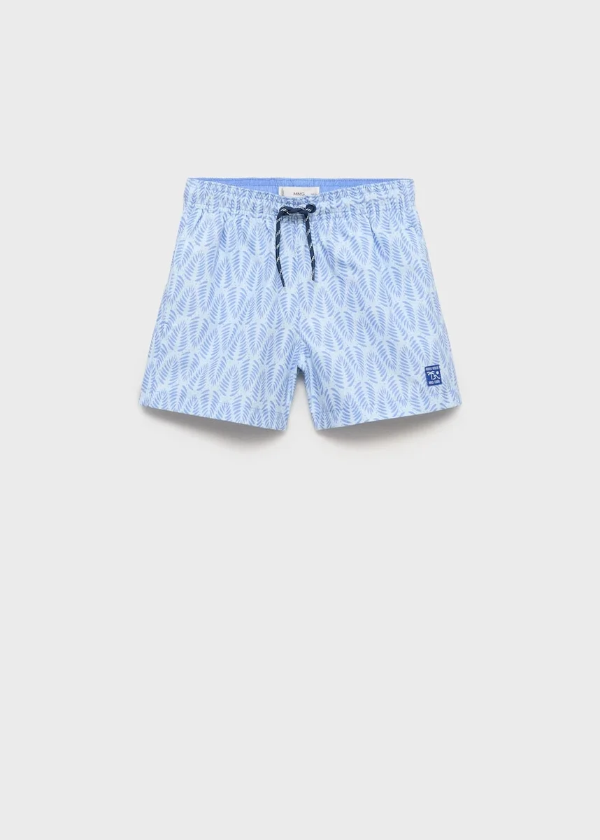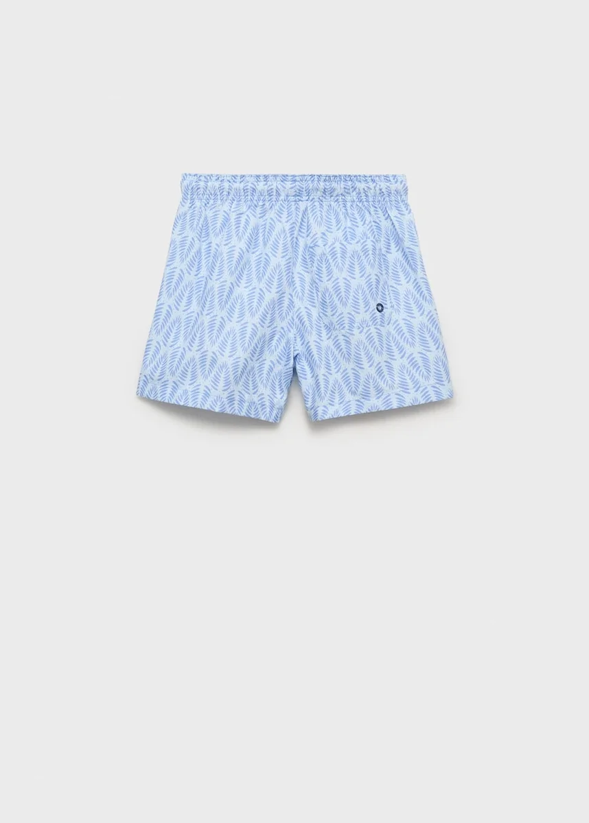 Modello dritto. Modello corto. Stampa con piume. Tasca applicata sul retro. Elastico in vita a contrasto con cordoncini regolabili.