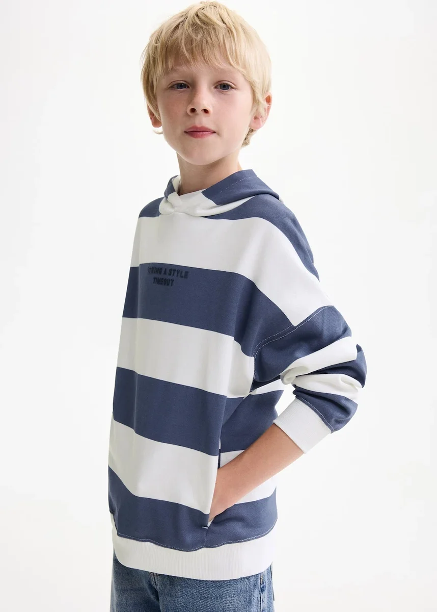 Tessuto 100% cotone. Taglio dritto. Design a righe. Con cappuccio. Maniche lunghe. Scritta stampata sul petto. Due tasche laterali.