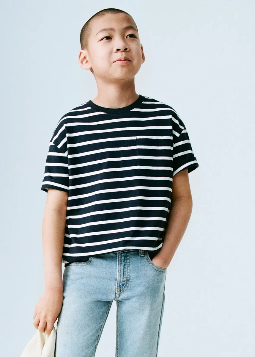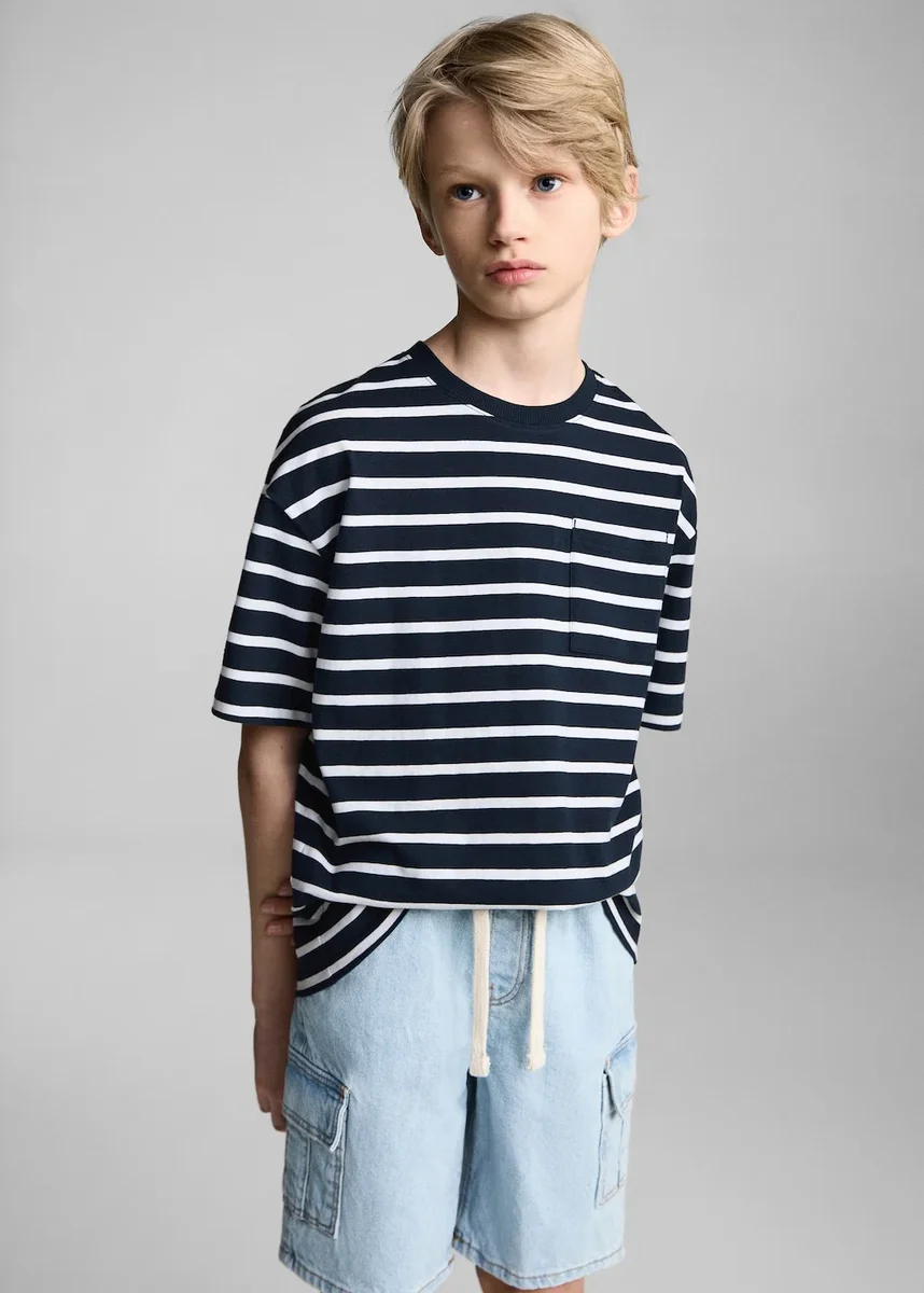 100% cotone. Design a righe. Tasca a filetto sul petto. Colletto a contrasto. Girocollo con finitura a costine. Maniche corte.