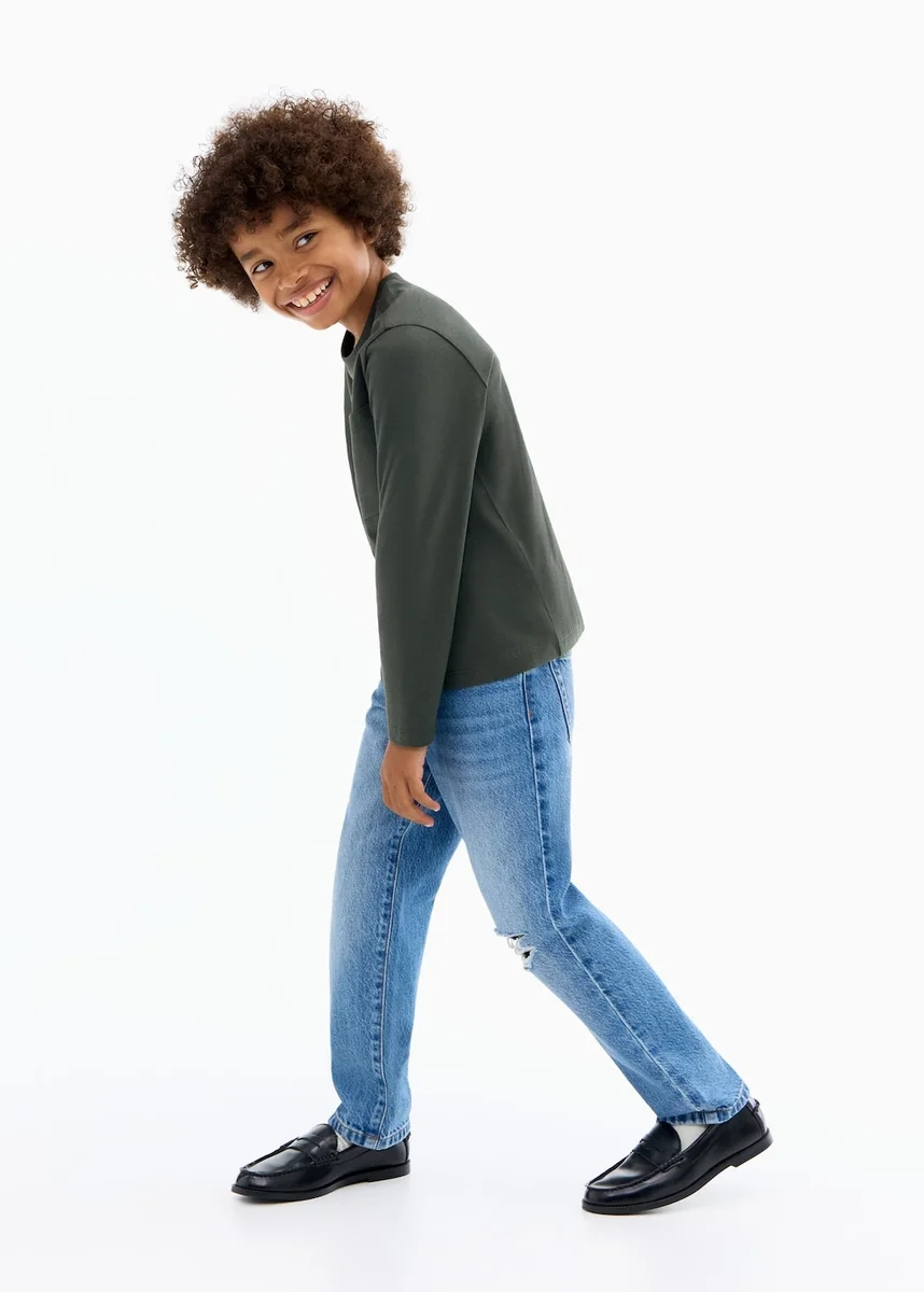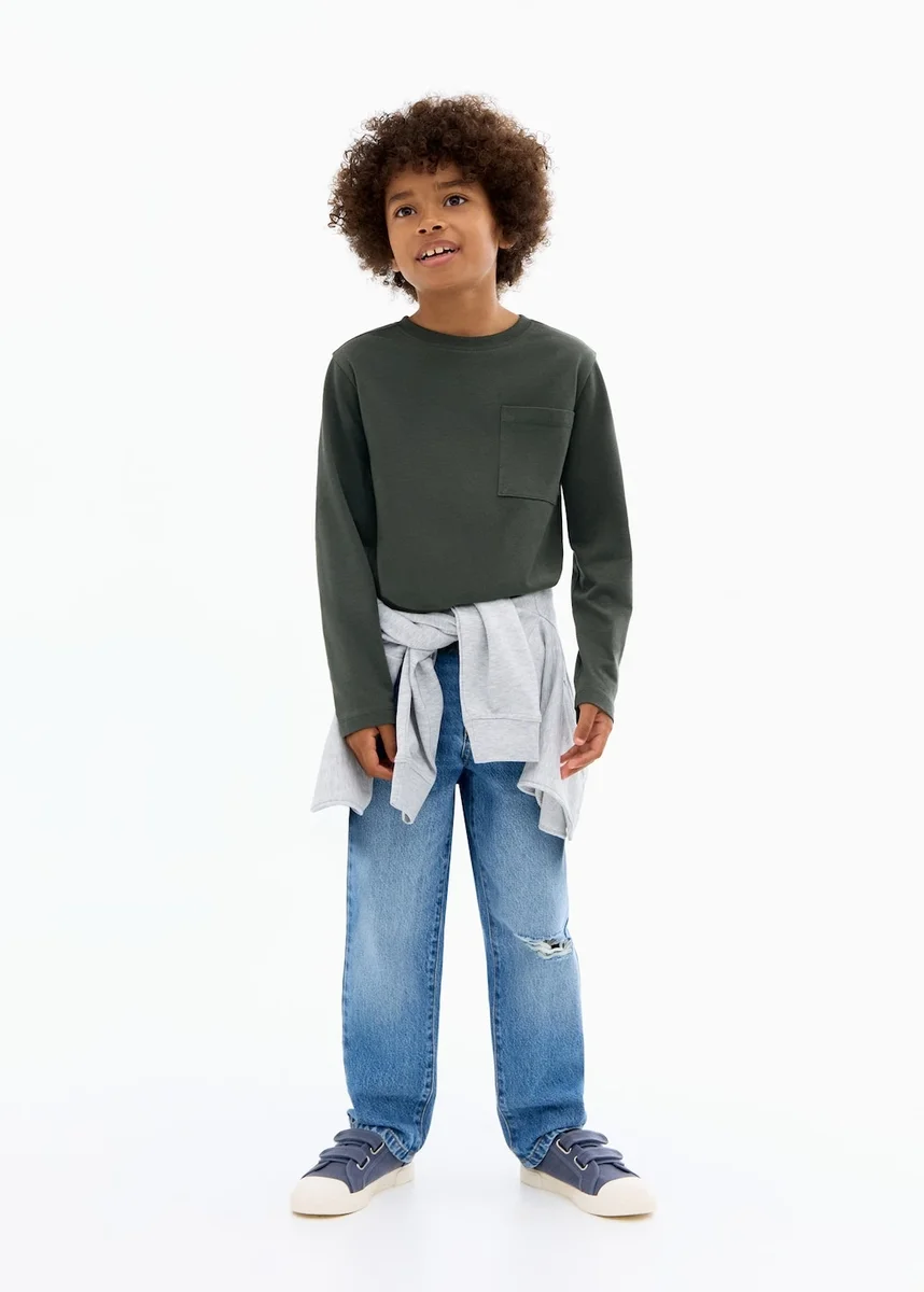 Tessuto 100% cotone. Design dritto. Girocollo a costine. Maniche lunghe. Tasca applicata sul davanti.