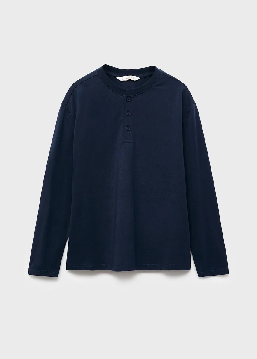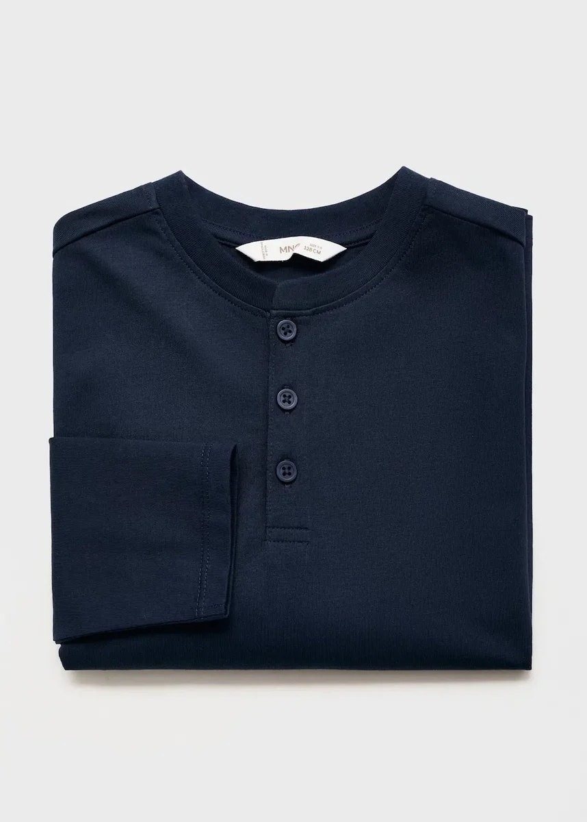 Tessuto 100% cotone. Modello dritto. Design semplice. Girocollo con chiusura a bottoni. Maniche lunghe