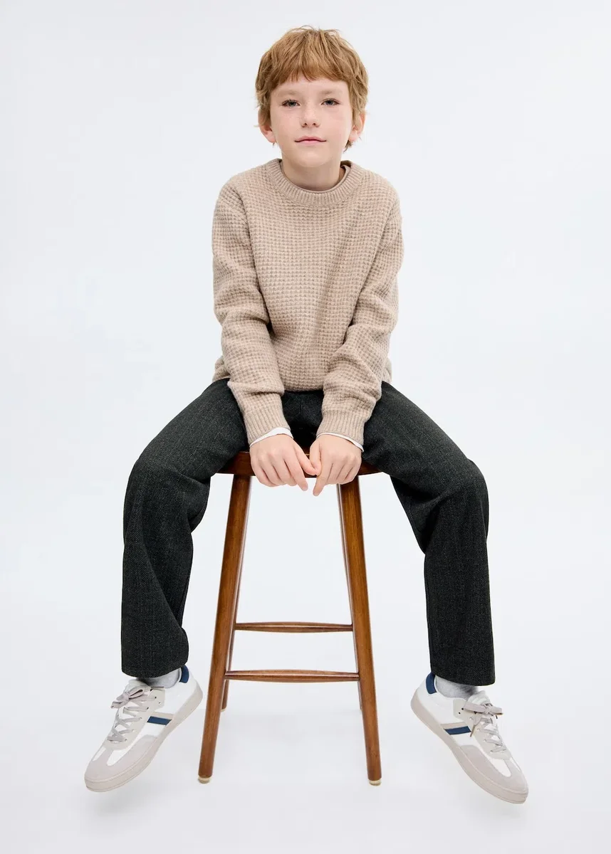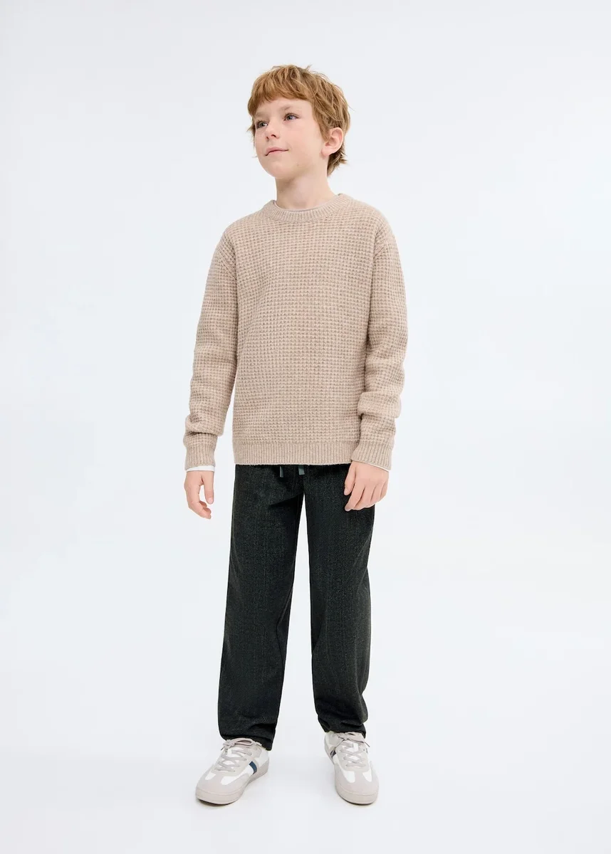 Modello dritto. Tessuto a spina di pesce. Vita regolabile con coulisse.
