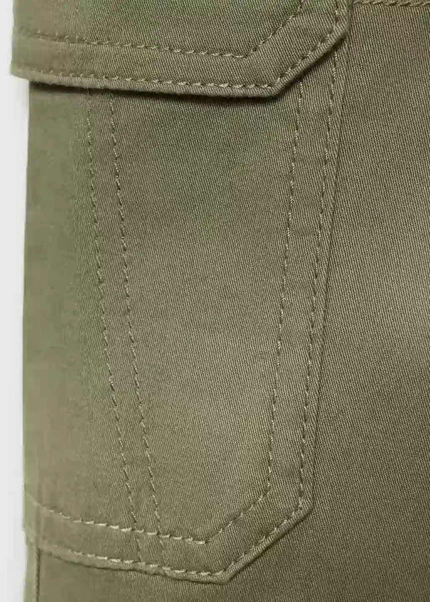 Tessuto in cotone. Tessuto elasticizzato. Modello lungo. Design cargo. Elastico in vita con coulisse regolabile. Due tasche laterali. Due tasche cargo. Ritorno a scuola.
