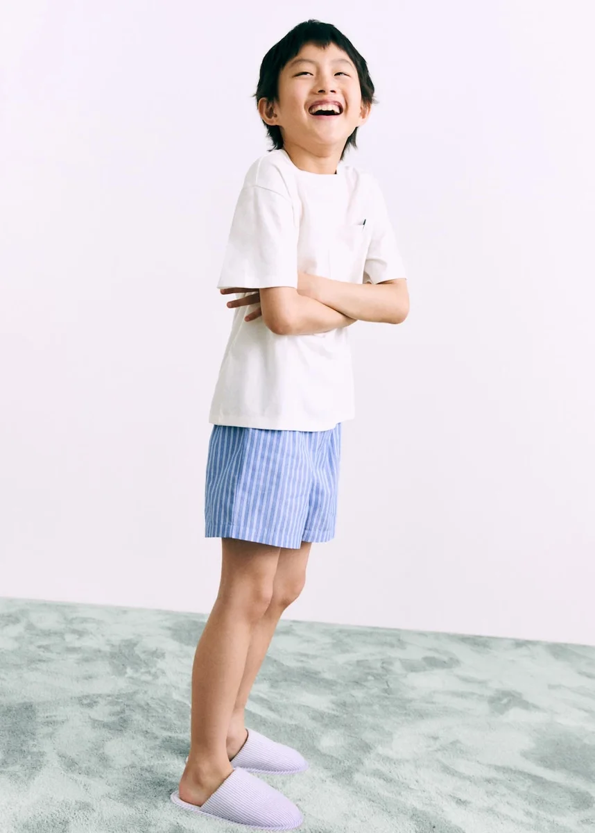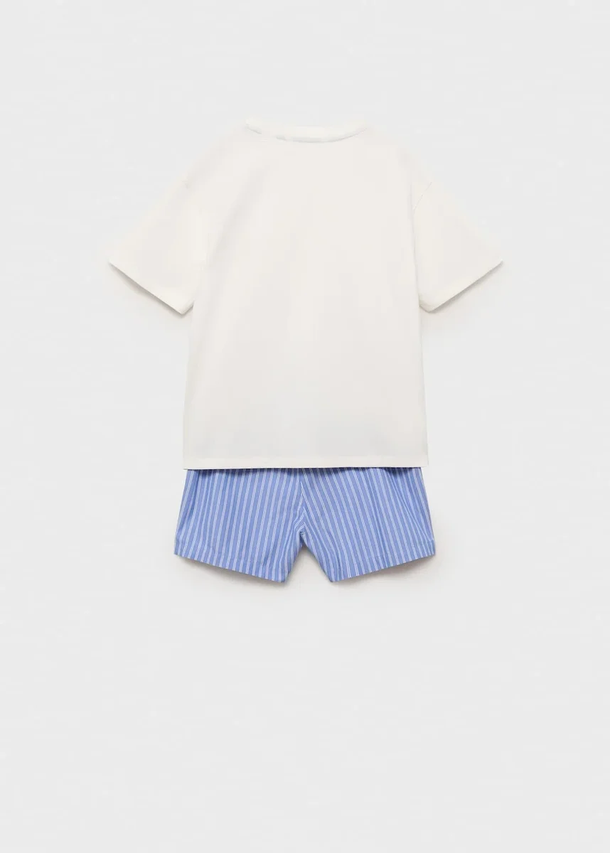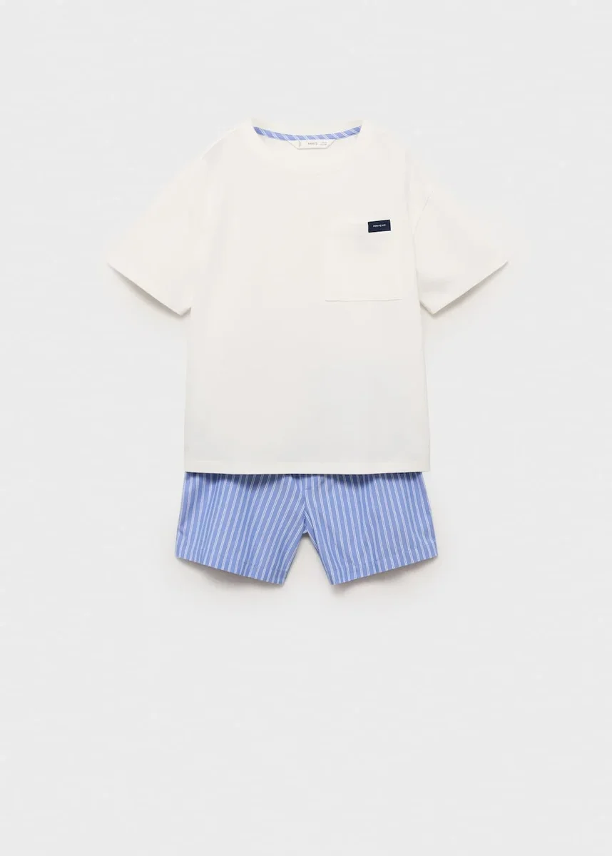 Confezione composta da maglietta a maniche corte e pantaloni corti da pigiama. Due pezzi. Tessuto 100% cotone. T-shirt. Girocollo. Tasca applicata. Pantaloncini a righe. Elastico in vita con coulisse. Prodotto promozionale