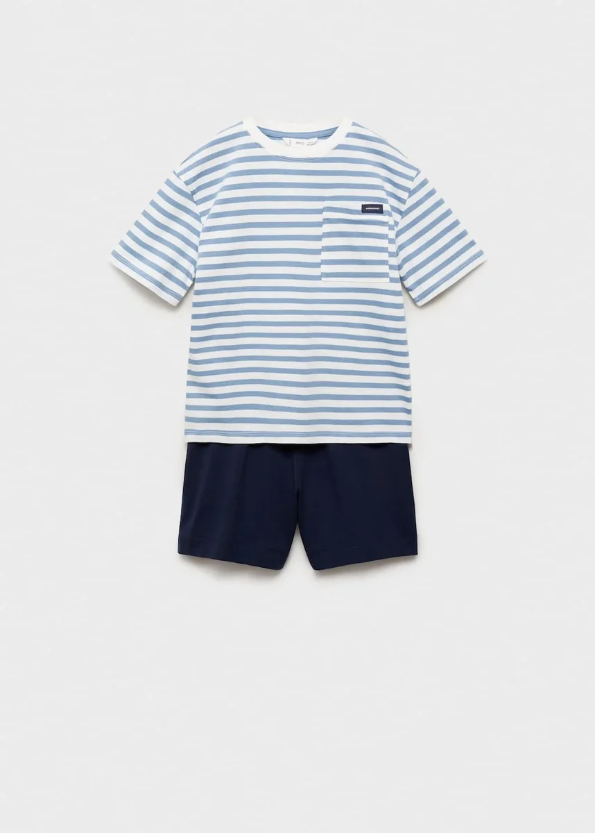 Confezione composta da maglietta a maniche corte e pantaloni corti da pigiama. Tessuto 100% cotone. Design a righe. Maglietta. Girocollo. Tasca applicata sul davanti. Pantaloncini. Elastico in vita con coulisse. Prodotto in promozione.