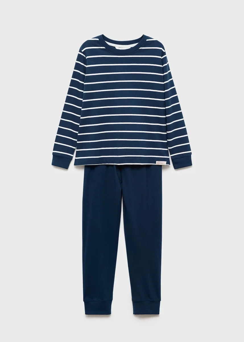 Tessuto 100% cotone. Design lungo. Design a righe. Girocollo. Maniche lunghe. Pantaloni lunghi. Pantaloni con elastico in vita e coulisse regolabile.