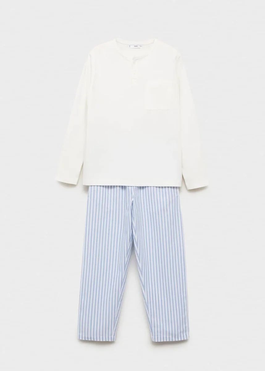 Confezione da 2. Tessuto 100% cotone. Design a righe. Collo arrotondato con chiusura a bottoni. Maniche lunghe. Tasca sul petto. Pantaloni con elastico in vita e coulisse regolabile.