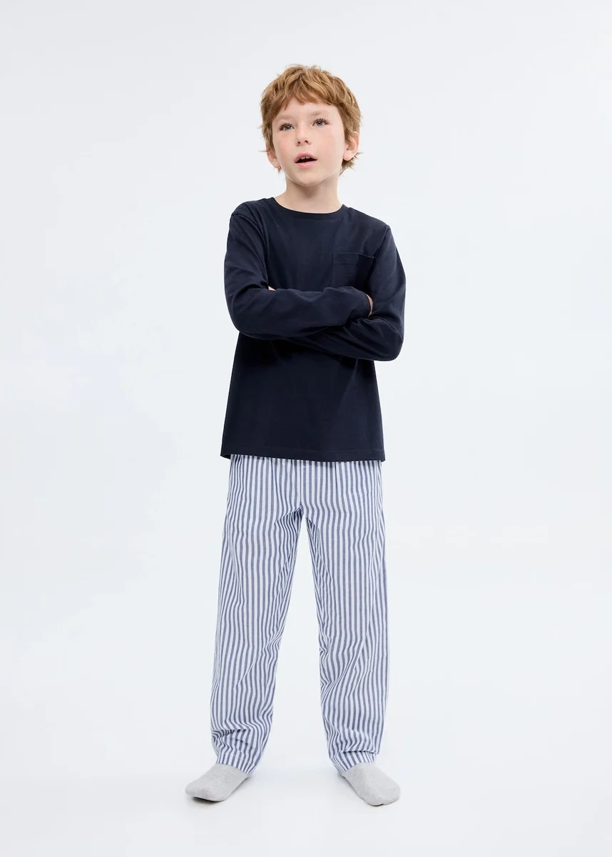 Confezione da 2. Tessuto 100% cotone. Pigiama lungo. Design a righe. Girocollo. Maniche lunghe. Pantaloni con elastico in vita e coulisse regolabile.