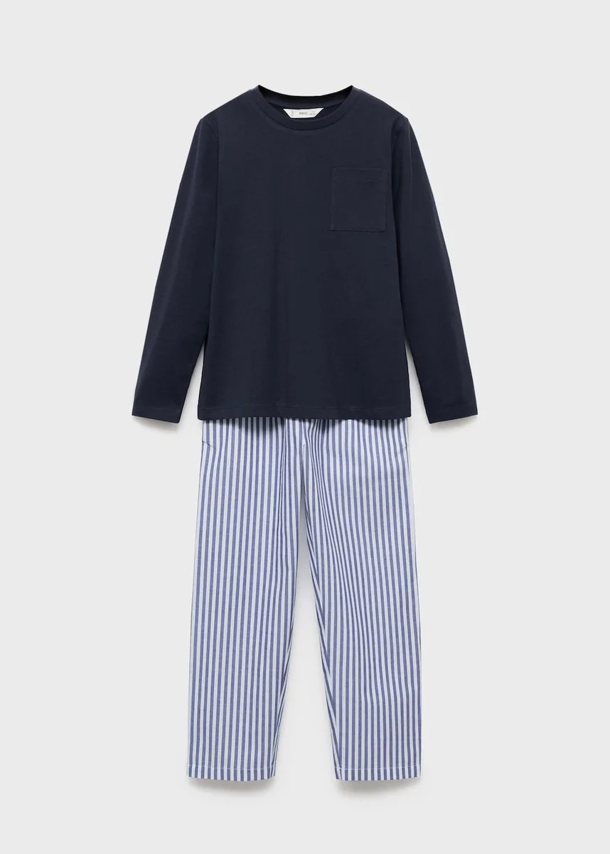 Confezione da 2. Tessuto 100% cotone. Pigiama lungo. Motivo a righe. Girocollo. Maniche lunghe. Pantaloni con elastico in vita e coulisse regolabile.