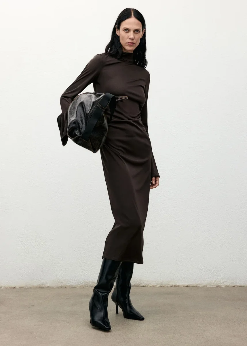 Modello midi. Vestibilità aderente. Collo alto. Maniche lunghe svasate. Volant laterali. Spacco posteriore sull’orlo. Chiusura con zip posteriore. Questo capo fa parte della nostra collezione casual, pensata per accompagnarti con stile nella tua vita quotidiana.