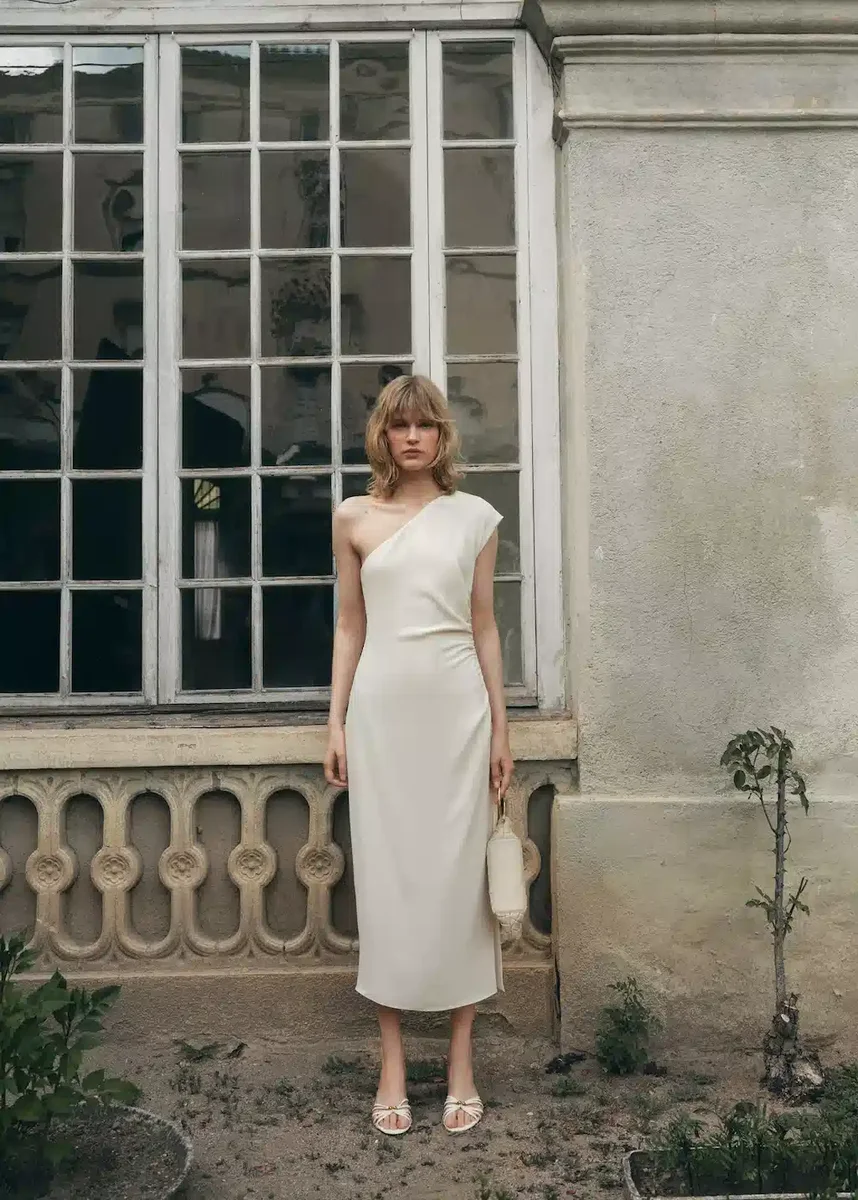Modello midi. Modello aderente. Scollo asimmetrico. Senza maniche. Volant laterali. Spacco laterale. Chiusura con zip laterale. Fodera interna