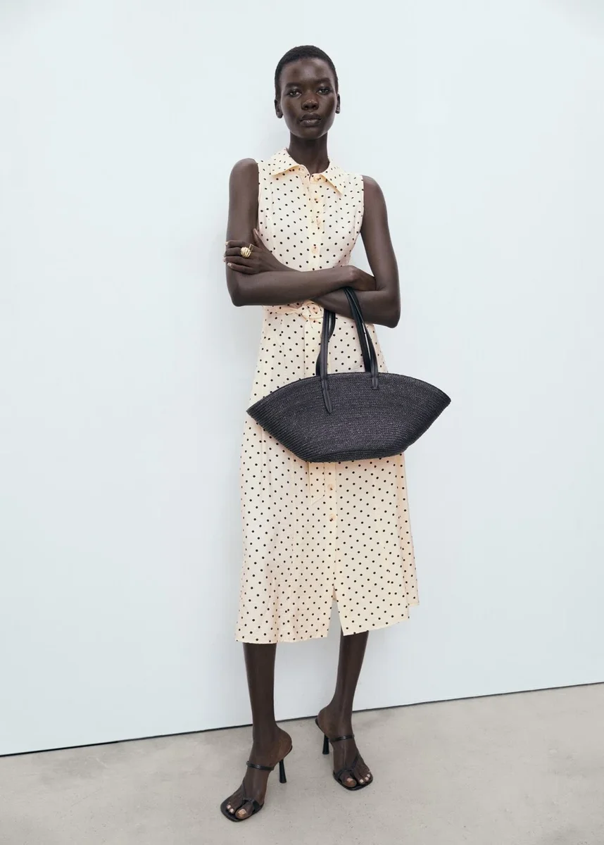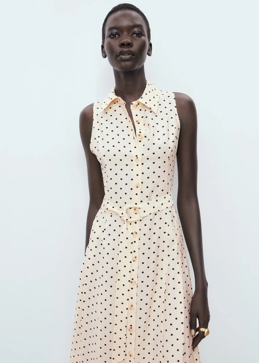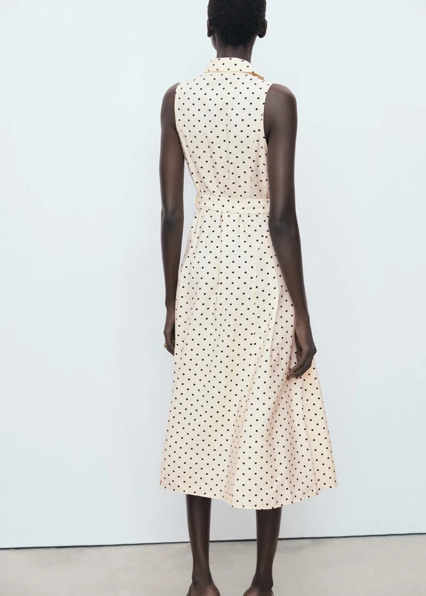 Modello midi. Taglio svasato. Stampa a pois. Collo camicia. Senza maniche. Spalline larghe. Cintura regolabile. Chiusura frontale con bottoni. Disponibile in taglie forti. Black Friday
