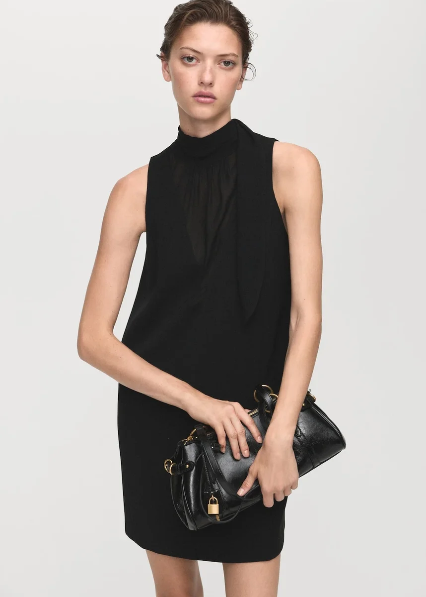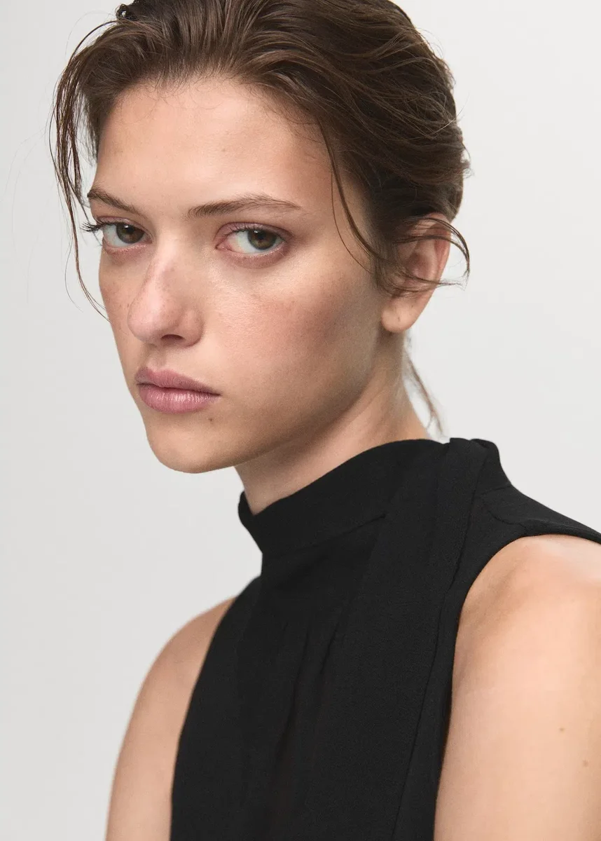 Modello corto. Design dritto. Collo alto. Senza maniche. Spalline larghe. Pannello semitrasparente. Chiusura con fiocco sul collo.
