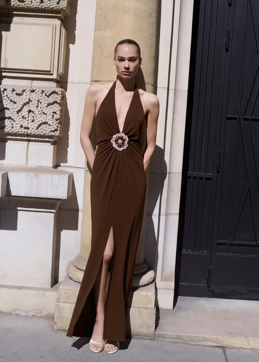 Questo abito è espressione di eleganza e raffinatezza, con scollo all’americana che valorizza la silhouette in modo raffinato. La gonna aperta aggiunge un tocco dinamico e sensuale al modello. Il fiore ricamato con sfumature su base in tulle è un dettaglio decorativo opulento ed è rimovibile, consentendo di personalizzare l’abito in base all’occasione. Tessuto fluido. Modello aderente. Modello lungo. Scollo all’americana. Scollo a V. Dettaglio fiore in paillettes sullo scollo. Senza maniche. Dettaglio cerchio sullo scollo. Dettagli arricciati. Chiusura con zip invisibile sul retro. Chiusura con bottoni sul collo. Fodera interna. Gli articoli della collezione CAPSULE possono essere cambiati o restituiti entro 14 giorni dalla data di spedizione. Questo capo fa parte della nostra collezione evento, pensata per renderti l’ospite perfetta a qualsiasi festa, matrimonio o cerimonia.