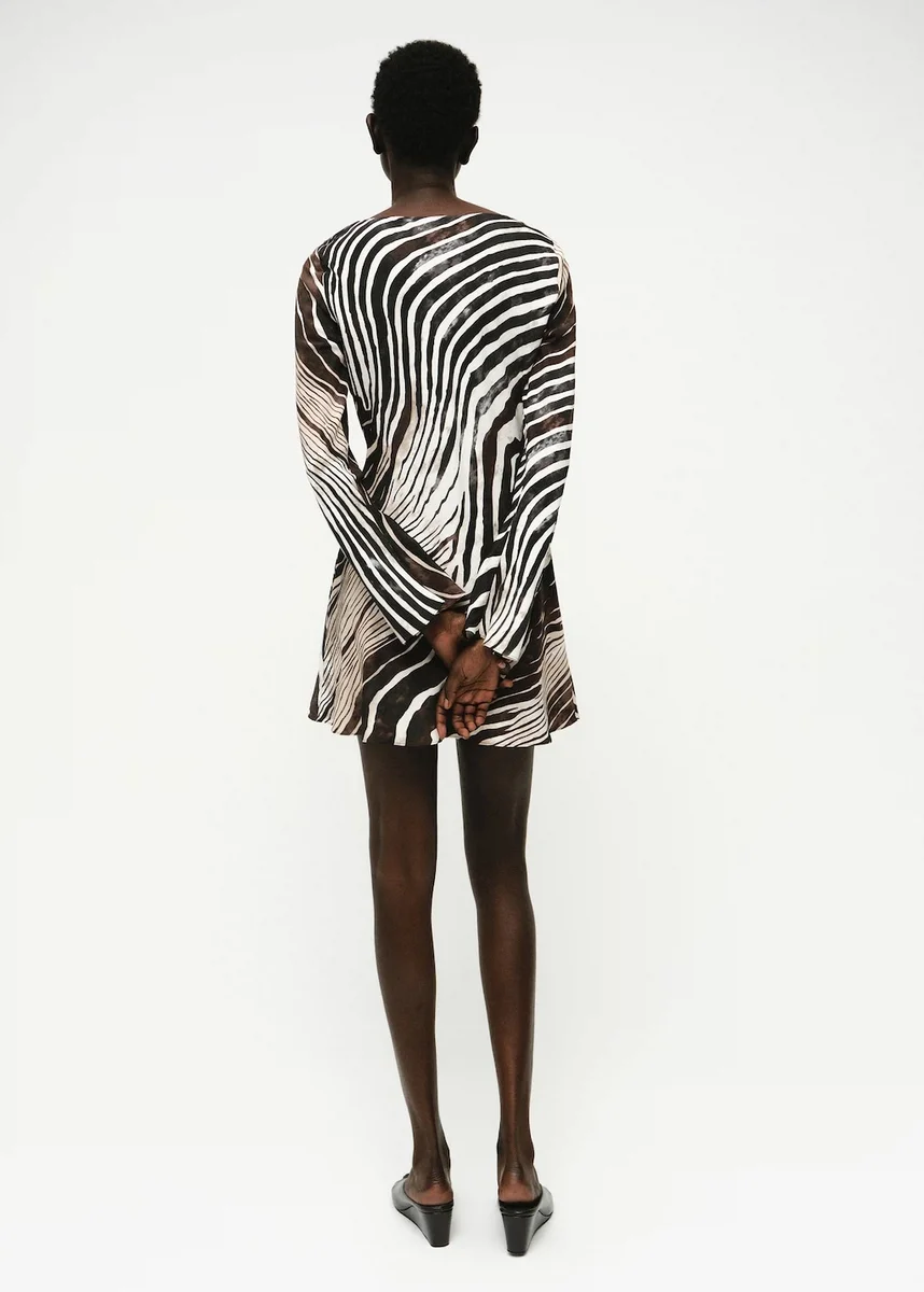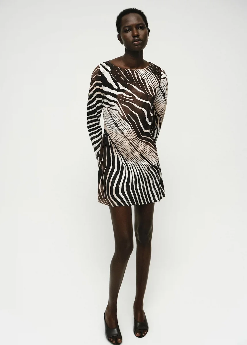 Modello corto. Taglio svasato. Stampa zebrata. Scollo a barchetta. Maniche lunghe. Senza chiusura. Fodera interna. Disponibile in taglie forti.