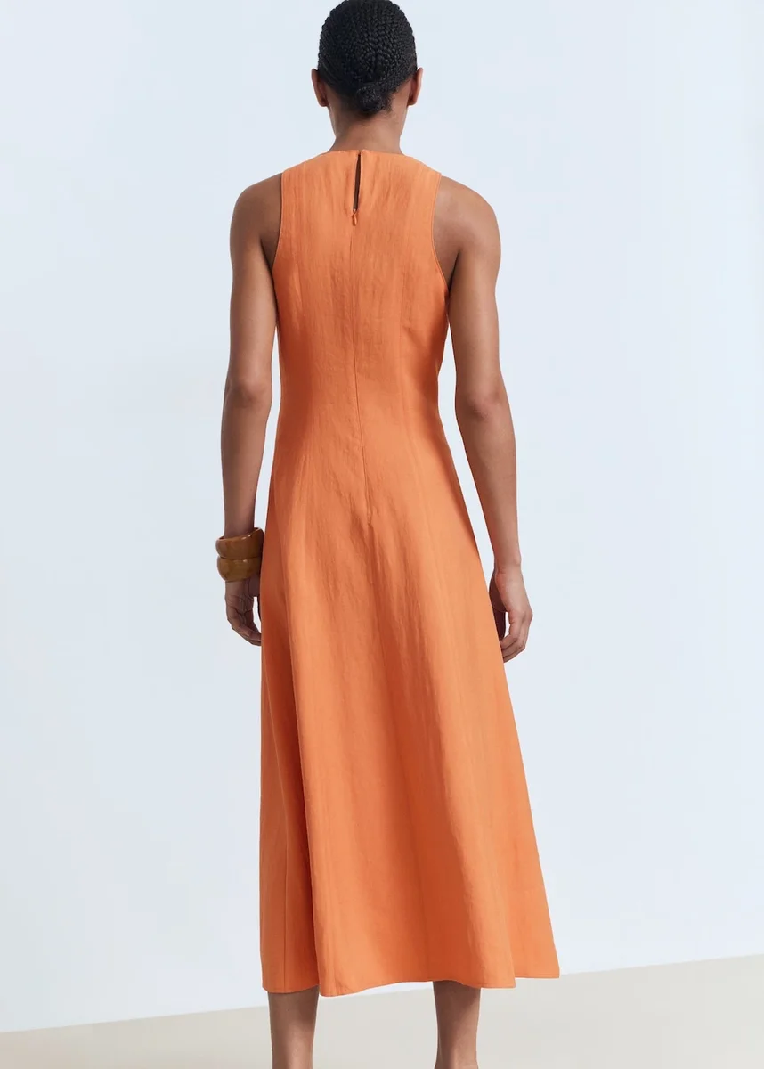 Modello midi. Modello svasato. Girocollo. Senza maniche. Spalline larghe. Chiusura con zip e bottoni sul retro. Il modello bianco è disponibile in taglie forti