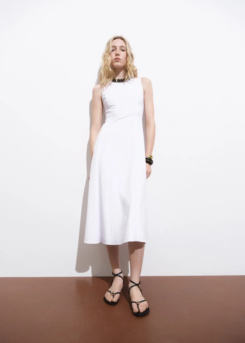 Modello midi. Taglio ad A. Girocollo. Senza maniche. Spalline larghe. Chiusura con zip sul retro. Fodera 100% cotone.