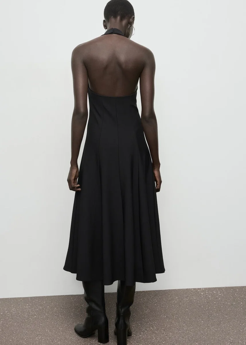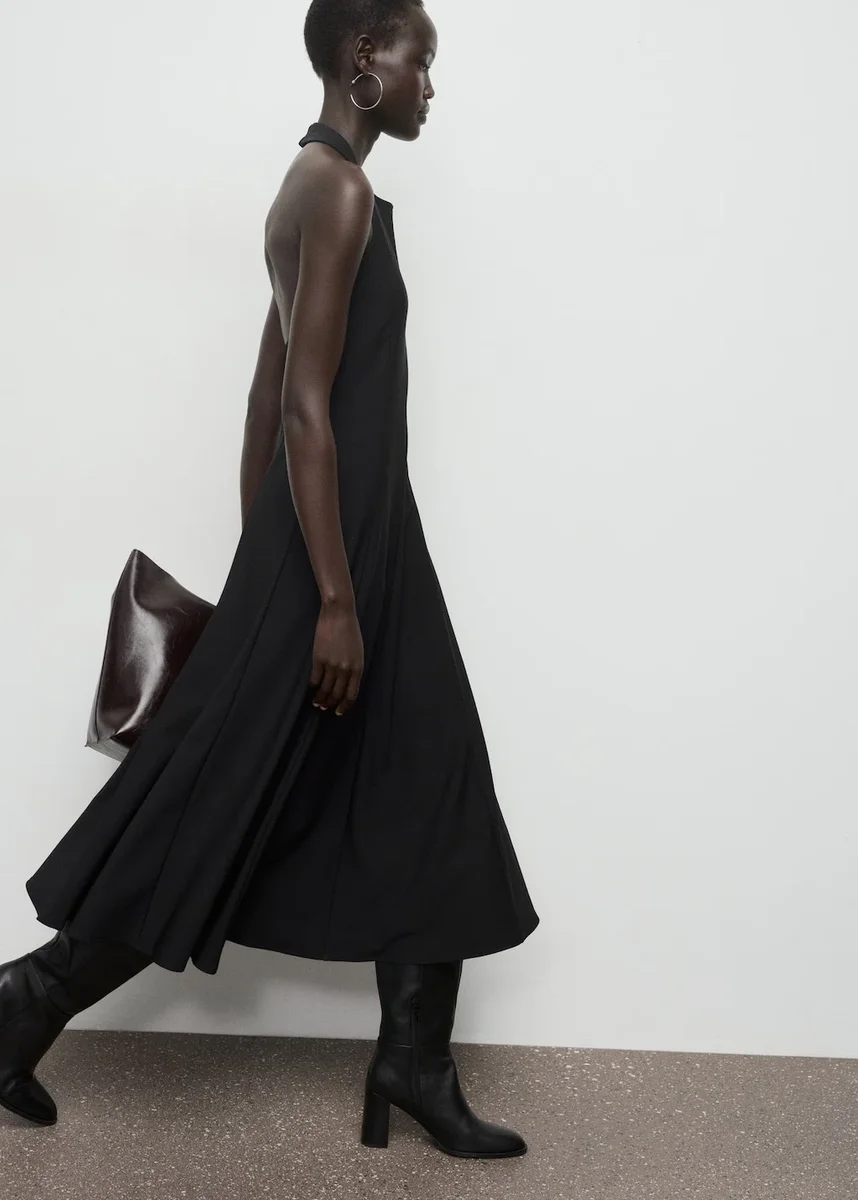 Modello midi. Modello svasato. Scollo all’americana. Senza maniche. Spalline larghe. Gonna a pieghe. Chiusura con zip laterale