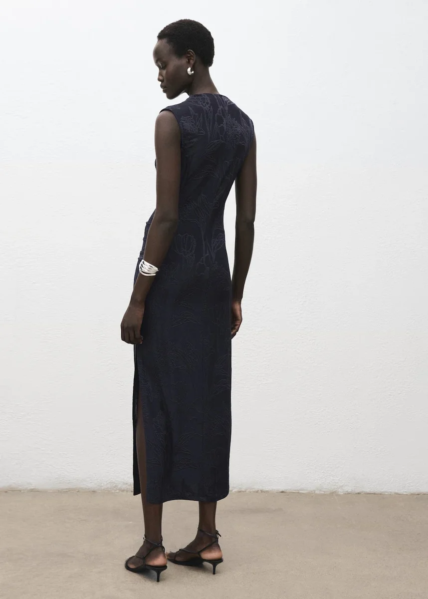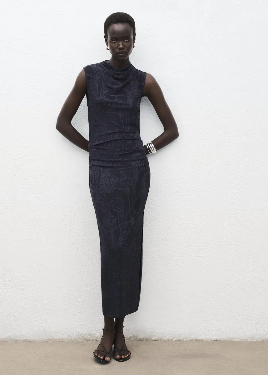 Modello aderente. Lunghezza midi. Ricami floreali. Collo drappeggiato. Senza maniche. Chiusura con zip laterale.