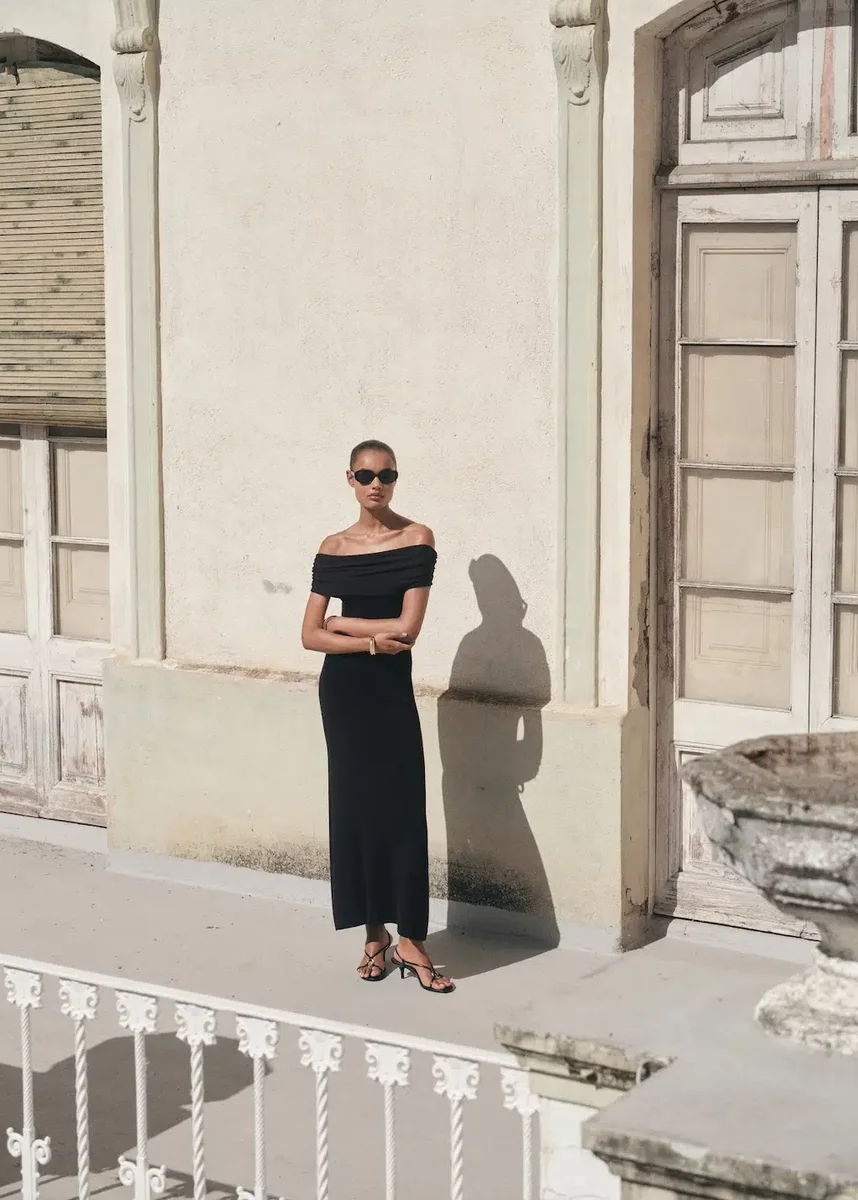 Tessuto a maglia fine. Modello lungo. Vestibilità aderente. Senza spalline. Scollo drappeggiato. Senza maniche. Senza chiusura.