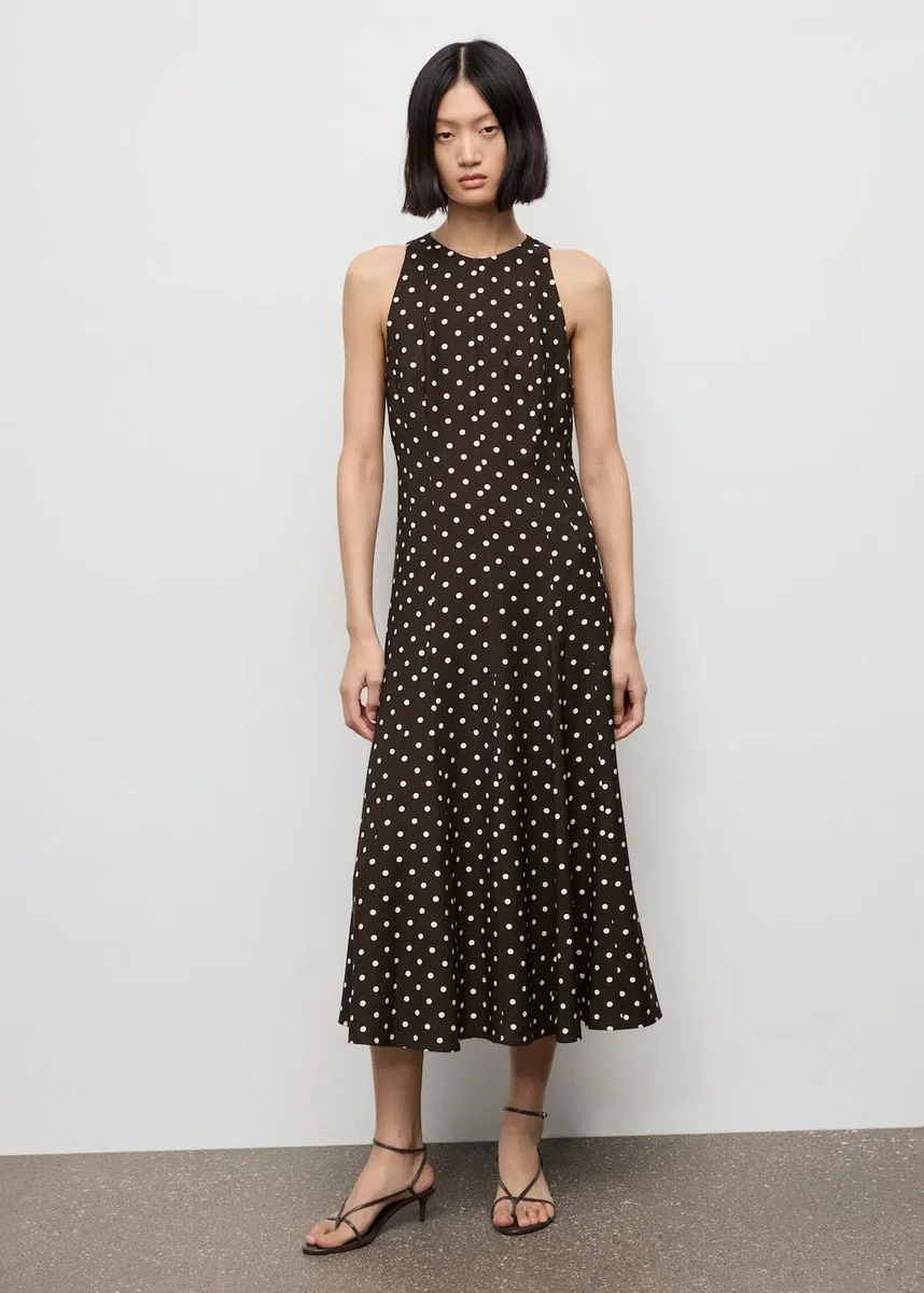 Motivo a pois. Modello midi. Modello svasato. Girocollo. Senza maniche. Spalline larghe. Chiusura con zip sul retro. Fodera interna. Black Friday.