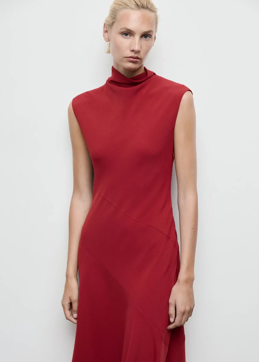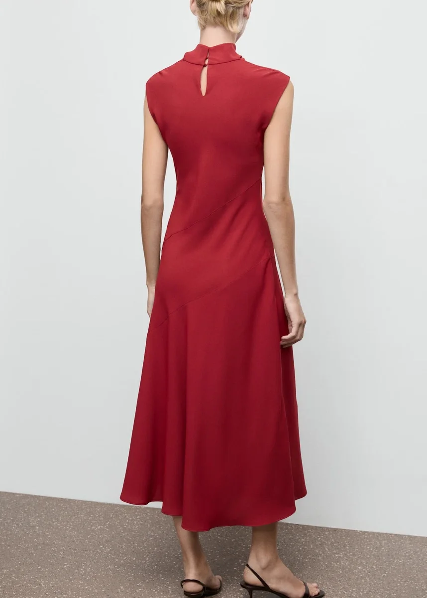 Modello lungo. Modello svasato. Collo alto. Senza maniche. Chiusura con bottoni sul retro. Fodera interna