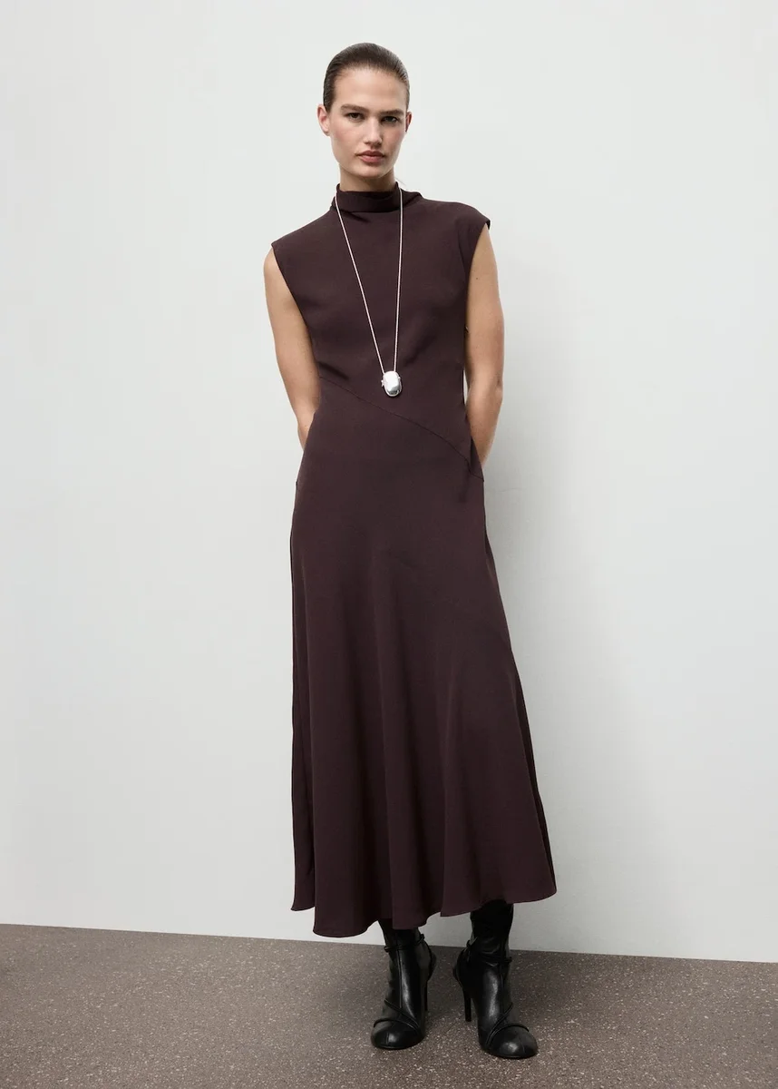 Modello lungo. Taglio svasato. Collo alto. Senza maniche. Spalline larghe. Chiusura con bottoni sul collo. Fodera interna.