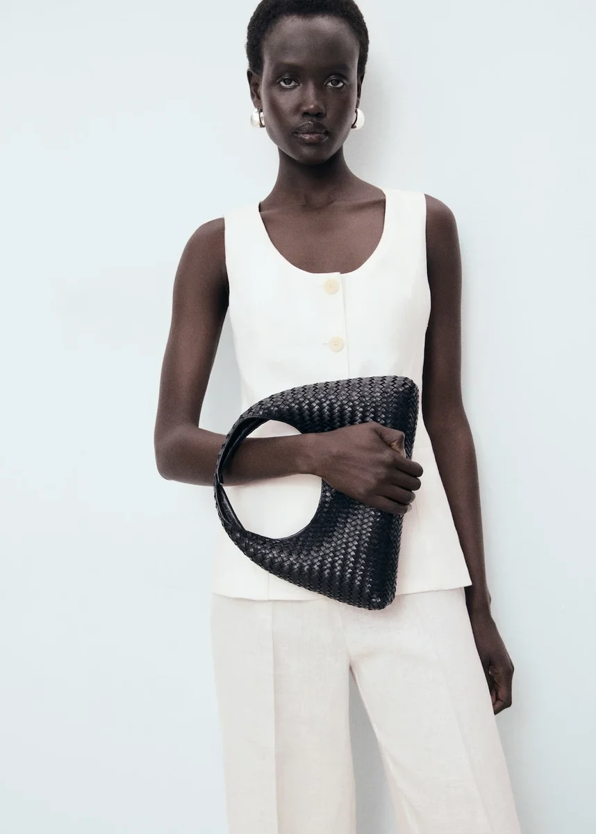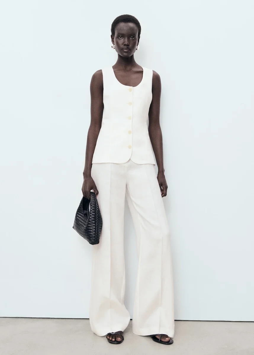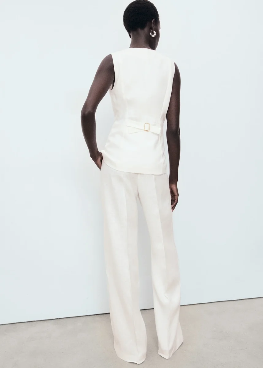 Tessuto 100% lino. Modello lungo. Modello dritto. Stile tailleur. Scollo basso. Dettaglio fibbia sul retro. Chiusura con bottoni sul davanti. Fodera 100% cotone.