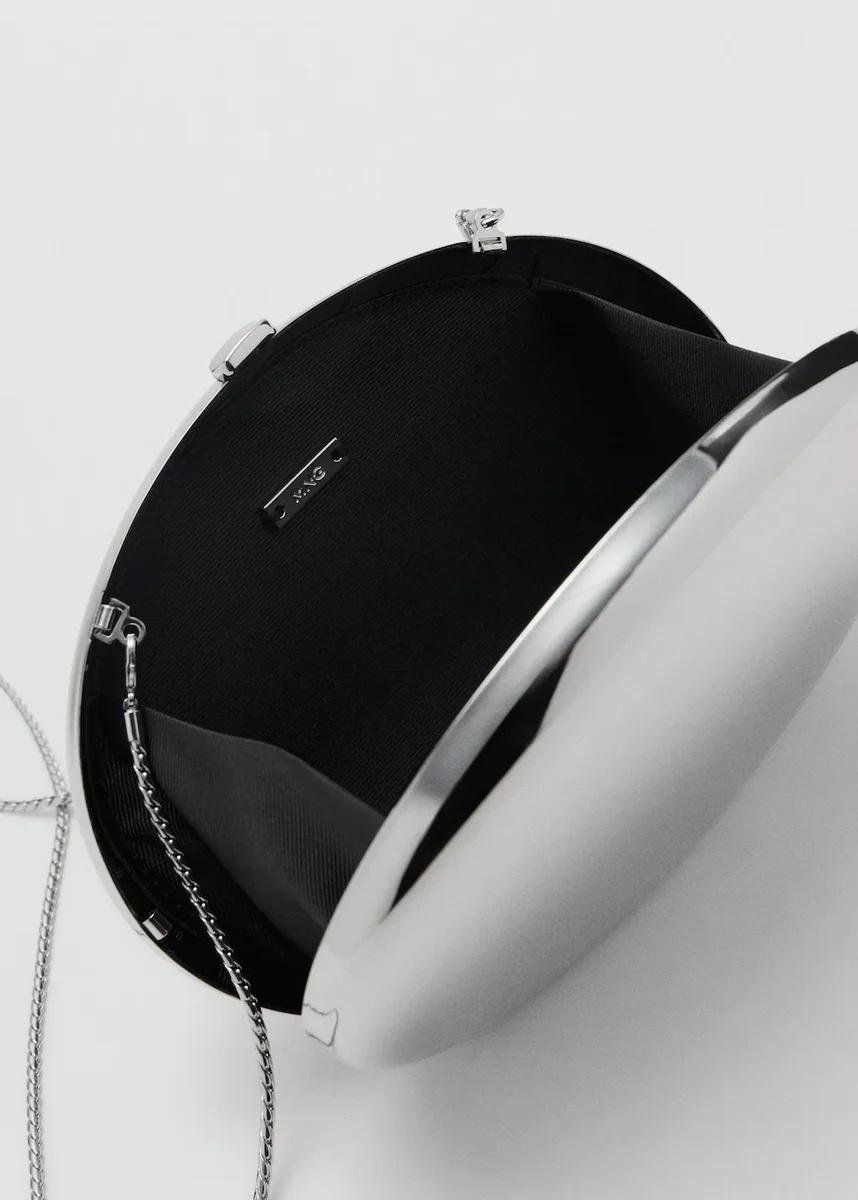 Design metallico. Design ovale. Stile pochette. Lunga tracolla a catena staccabile. Chiusura con bottone a pressione in metallo. Fodera interna