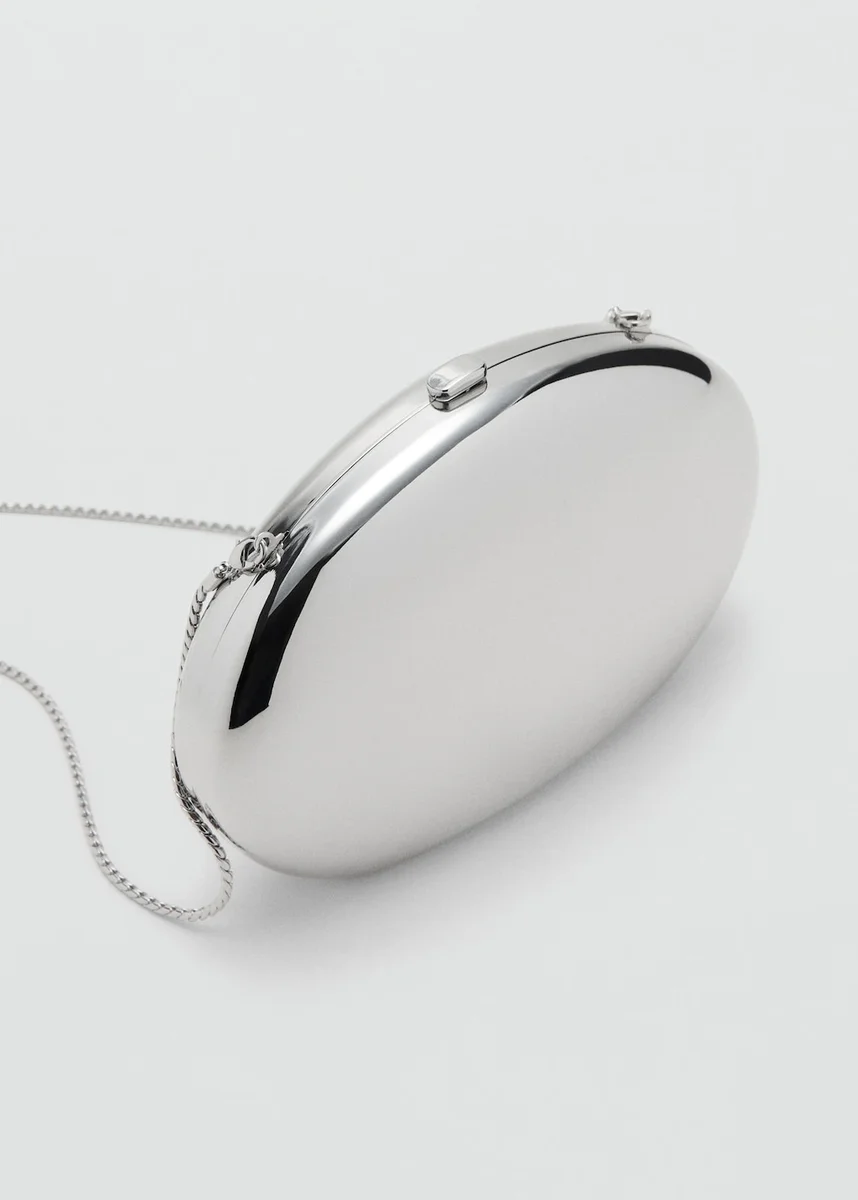 Design metallico. Design ovale. Stile pochette. Lunga tracolla a catena staccabile. Chiusura con bottone a pressione in metallo. Fodera interna.