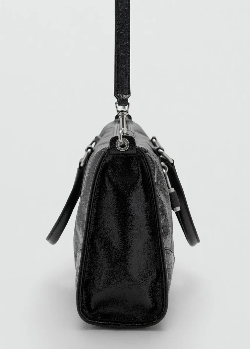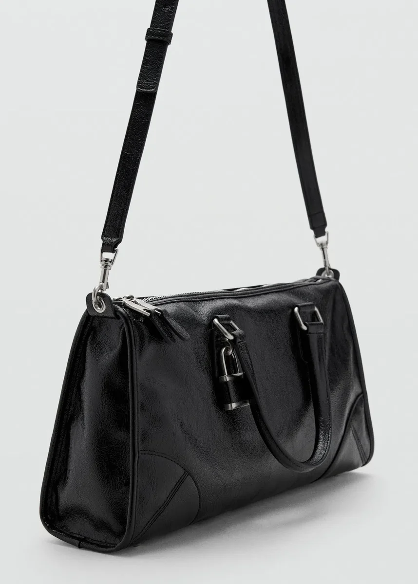 Effetto pelle. Finitura lucida. Design rettangolare. Due manici corti. Tracolla lunga removibile. Chiusura con cerniera. Dettaglio lucchetto. Fodera interna.