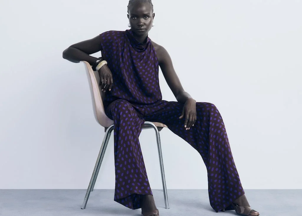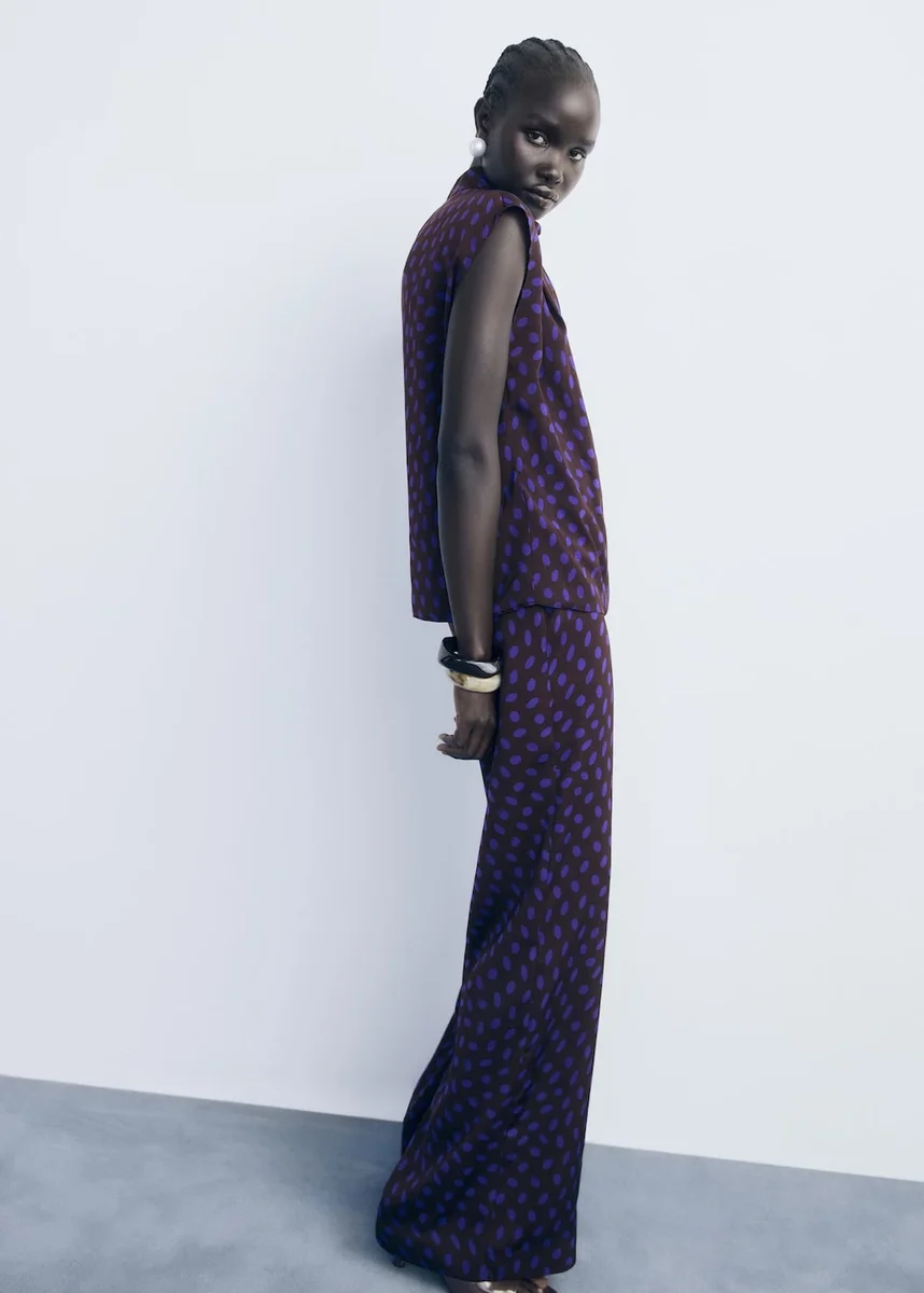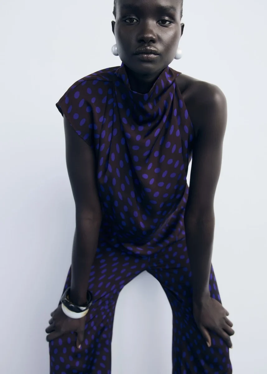 Con un design dritto e a pois, questo capo presenta una scollatura drappeggiata e maniche asimmetriche. È abbinato a pantaloni coordinati per un look totale speciale