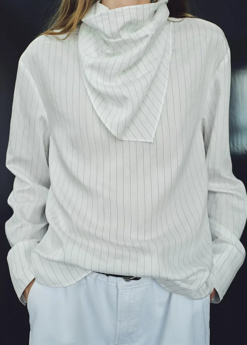 Dal design dritto e a righe, questo capo presenta una scollatura rotonda e maniche lunghe. Include un foulard e una chiusura con bottoni sul retro. Disponibile in taglie forti