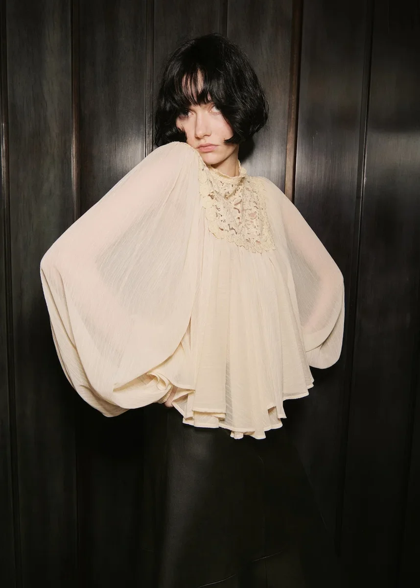 Caratterizzato da un taglio svasato e da una combinazione di materiali, questo capo presenta un inserto in pizzo con scollo rotondo e maniche lunghe. Si chiude con un bottone sul collo