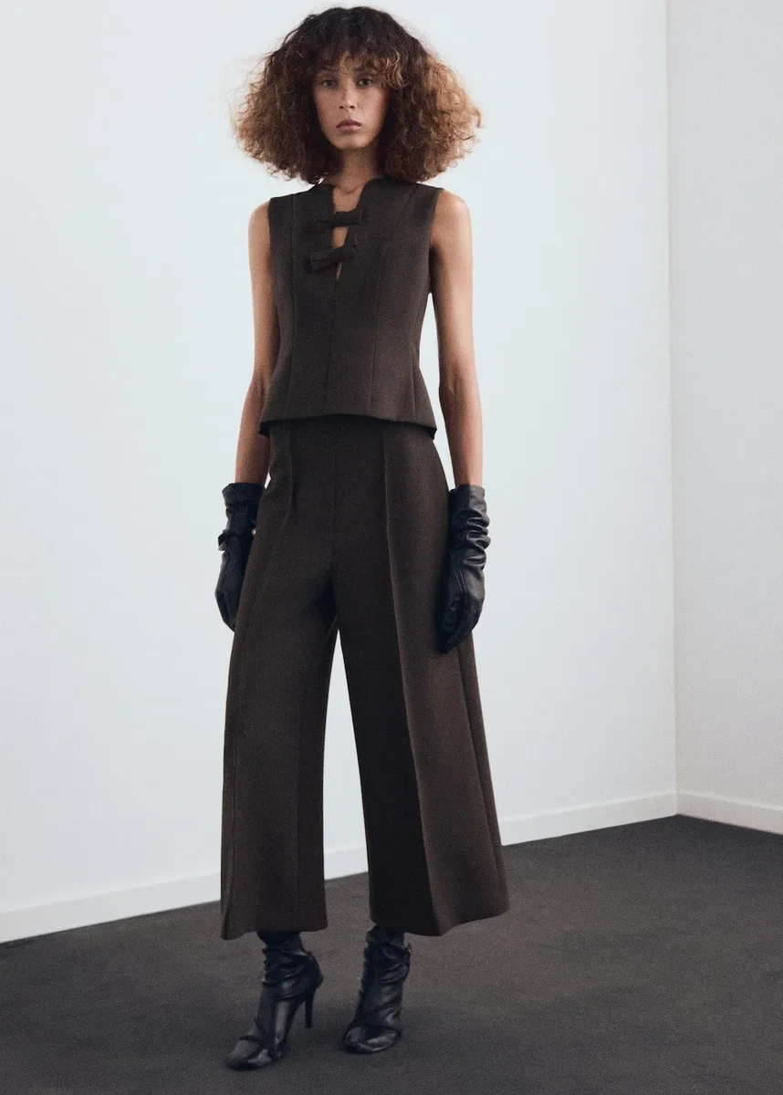 Dal taglio aderente, questo capo presenta uno scollo a V impreziosito da dettagli a fiocco. Dotato di spalline larghe, è completato da una chiusura con zip sul retro. È abbinato a pantaloni coordinati