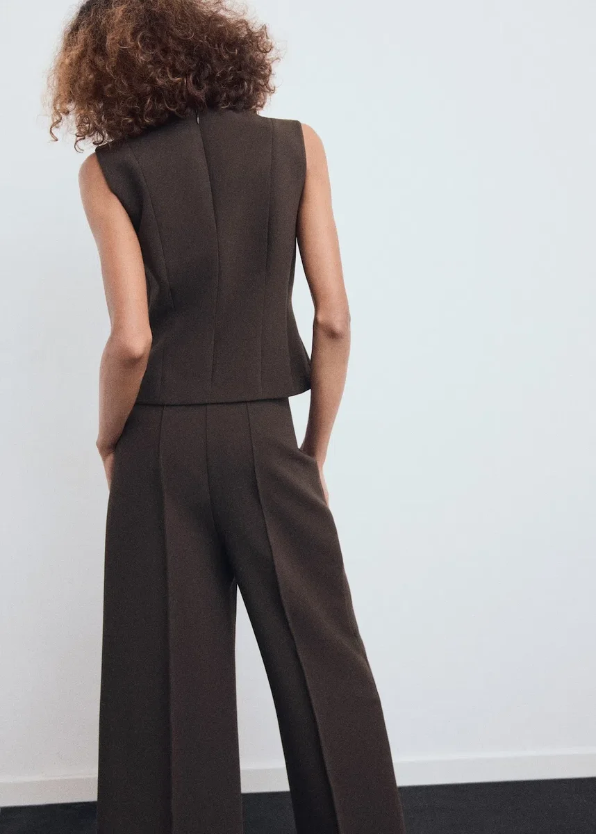 Dal taglio aderente, questo capo presenta uno scollo a V impreziosito da dettagli a fiocco. Con spalline larghe, è completato da una chiusura con zip sul retro. È abbinato a pantaloni coordinati