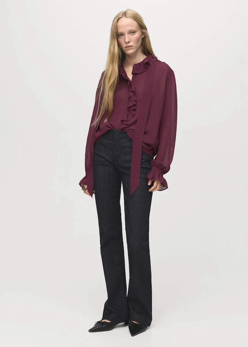 Con un design dritto e volant, questo capo presenta una scollatura rotonda impreziosita da un foulard. Le maniche lunghe hanno polsini con bottoni e la chiusura frontale è completata da bottoni.