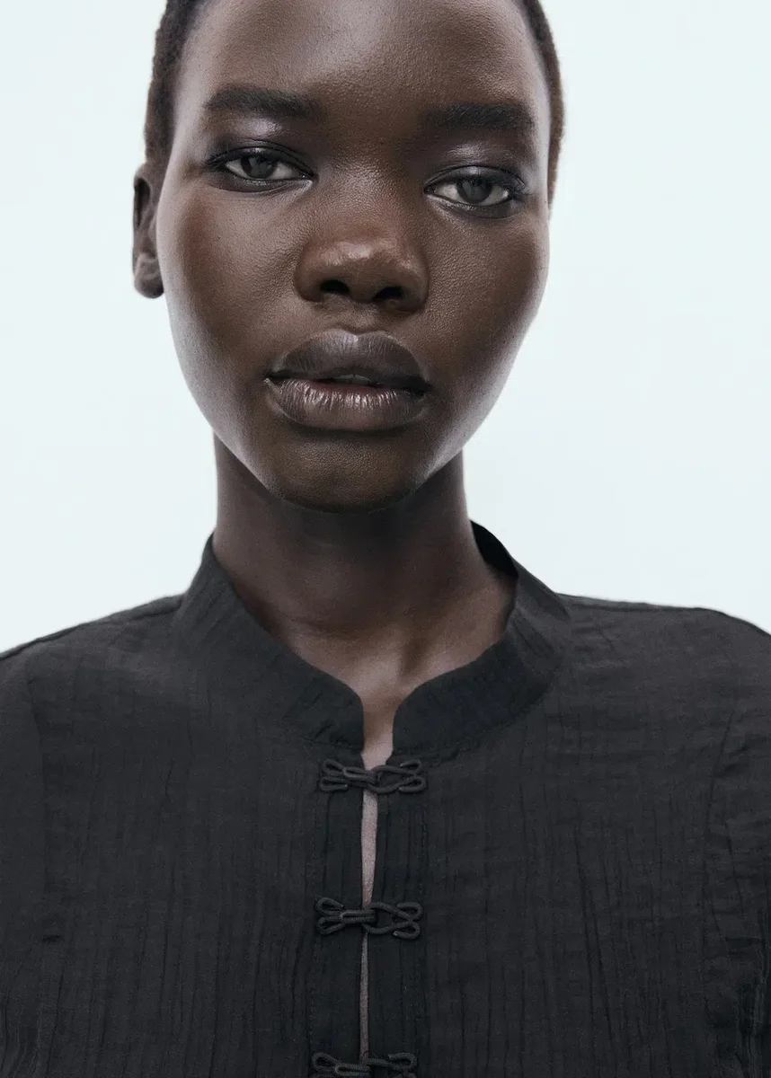 Questa camicetta in lyocell, con una texture leggermente increspata e bottoni a toggle, unisce raffinatezza e modernità. Il collo a fascia e il taglio dritto la rendono un capo versatile e intramontabile, perfetto per chi cerca uno stile raffinato e distintivo.