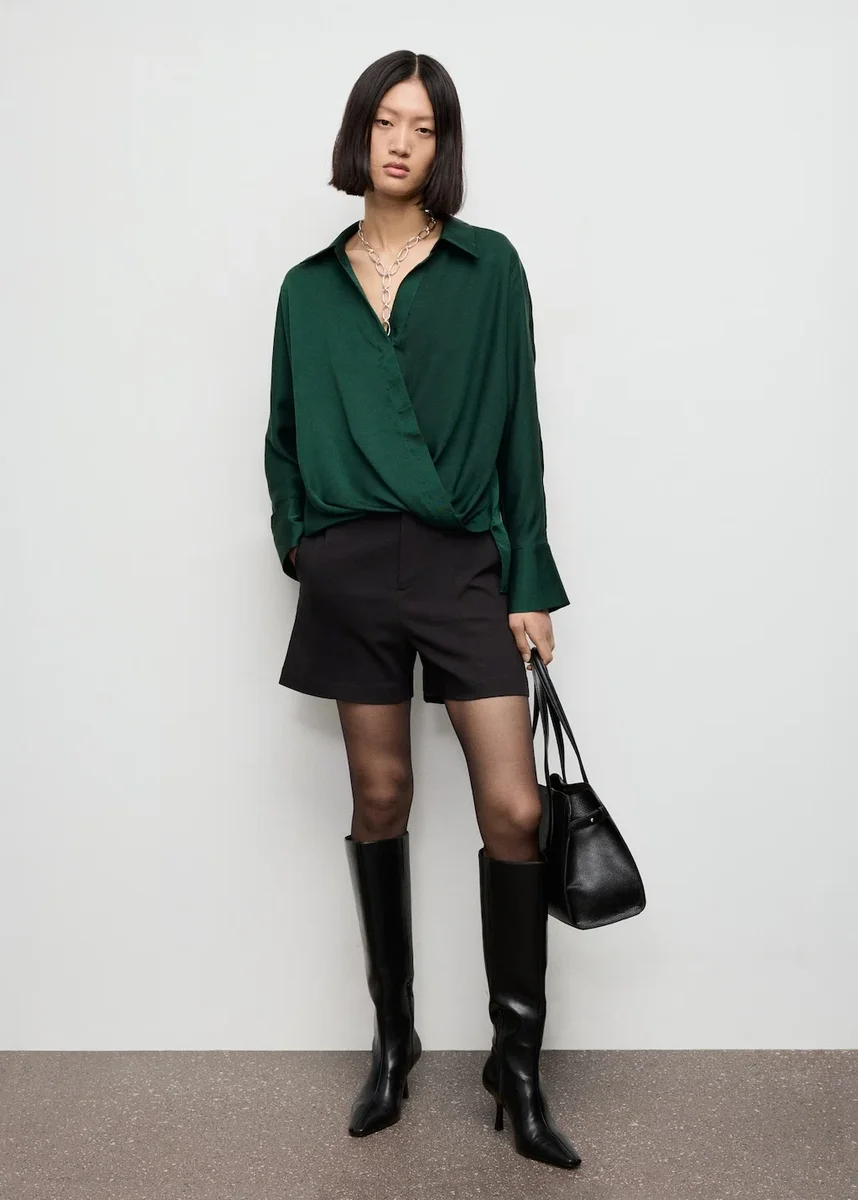 Realizzato in tessuto satinato, questo capo presenta un design avvolgente con collo camicia. Le maniche lunghe hanno polsini con bottoni e la chiusura frontale include bottoni nascosti.