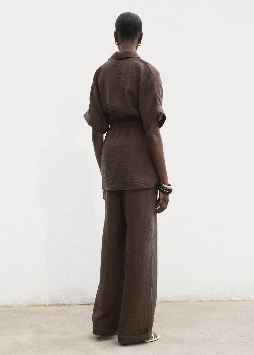 Tessuto misto lyocell. Effetto stropicciato. Modello lungo. Collo camicia. Maniche corte con polsini risvoltati. Chiusura frontale con bottoni. Vita elasticizzata con chiusura a laccio. Total look