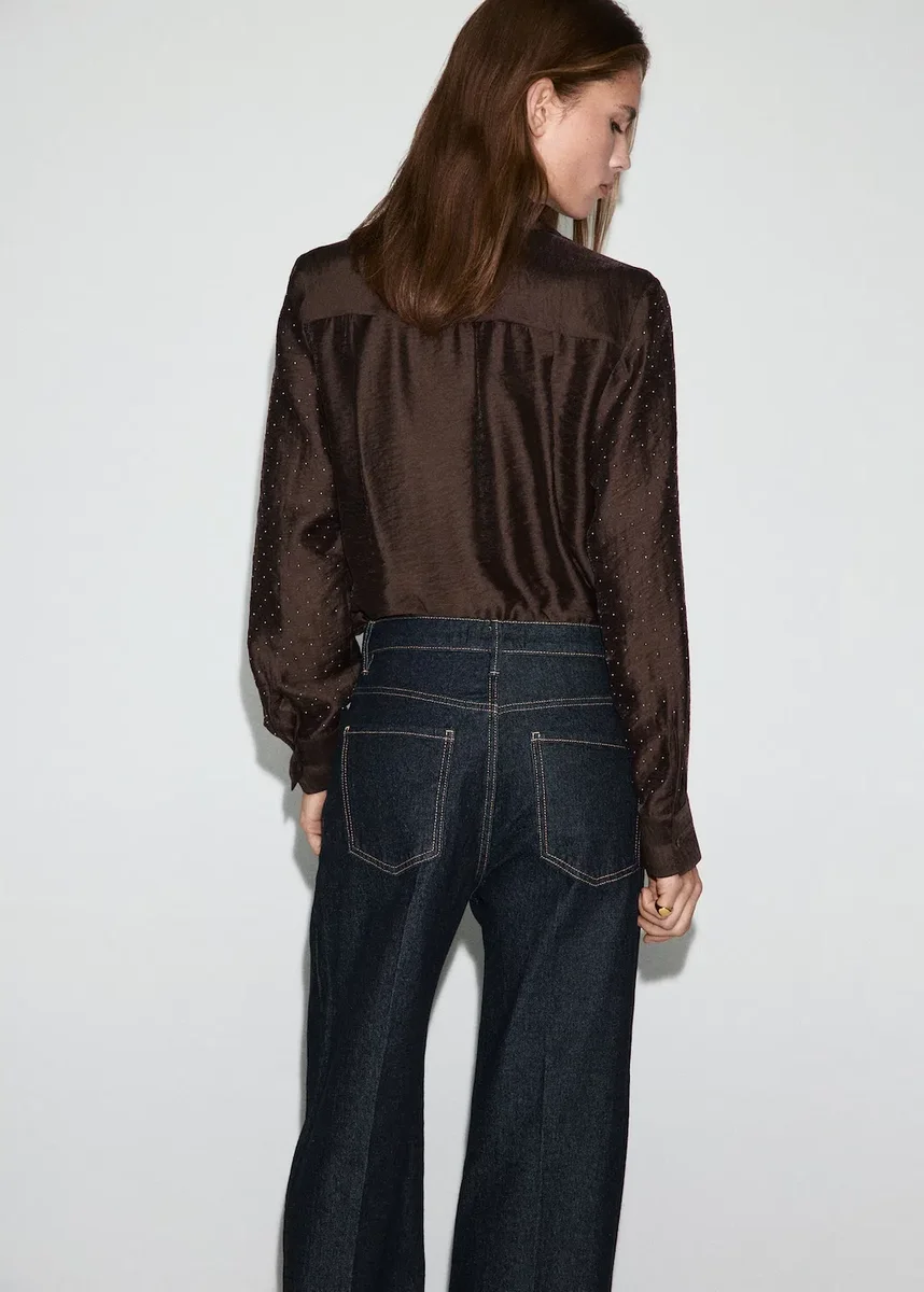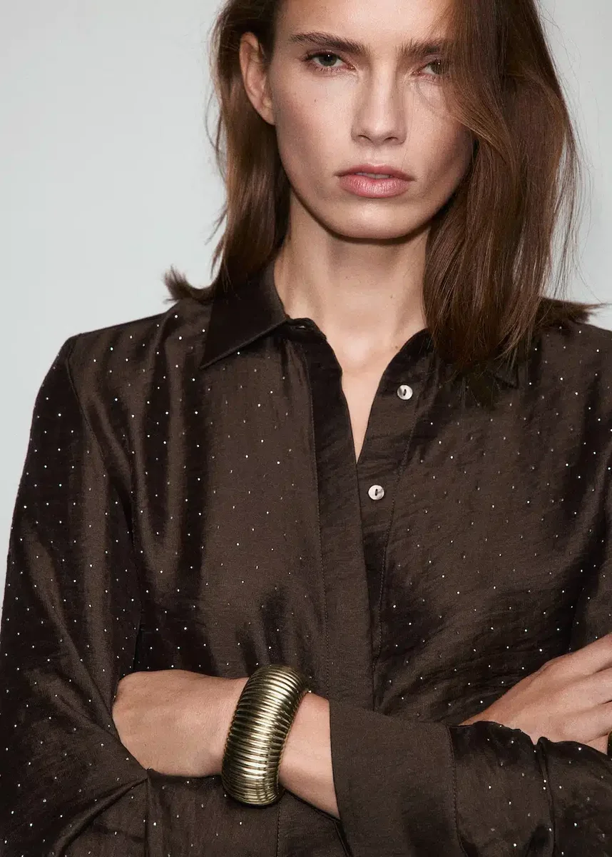 Realizzato in tessuto satinato, questo capo presenta un design dritto con dettagli in strass. Include un colletto camicia e maniche lunghe con polsini abbottonati. La chiusura frontale con bottoni nascosti completa il suo stile. Disponibile in taglie forti
