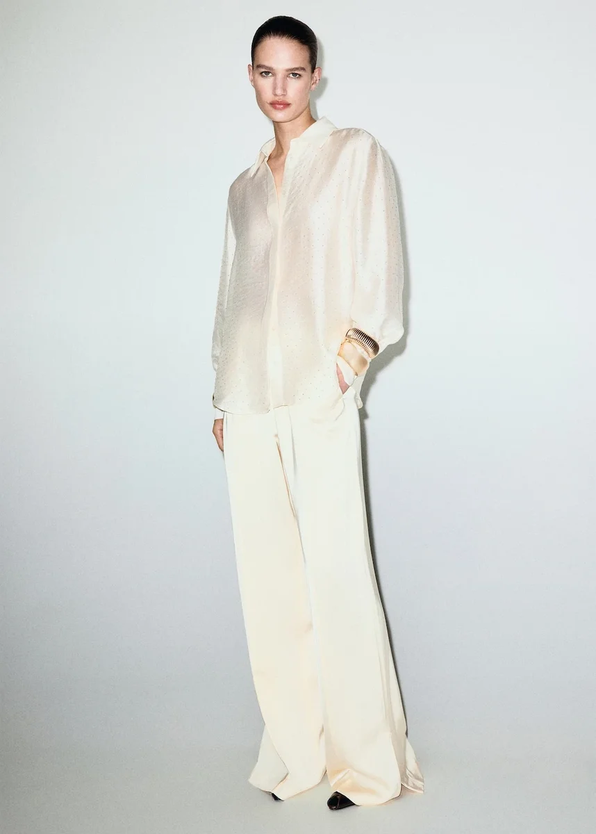 Realizzato in tessuto satinato, questo capo presenta un design dritto con dettagli in strass. Include collo camicia e maniche lunghe con polsini abbottonati. La chiusura frontale con bottoni nascosti completa il suo stile. Disponibile in taglie forti