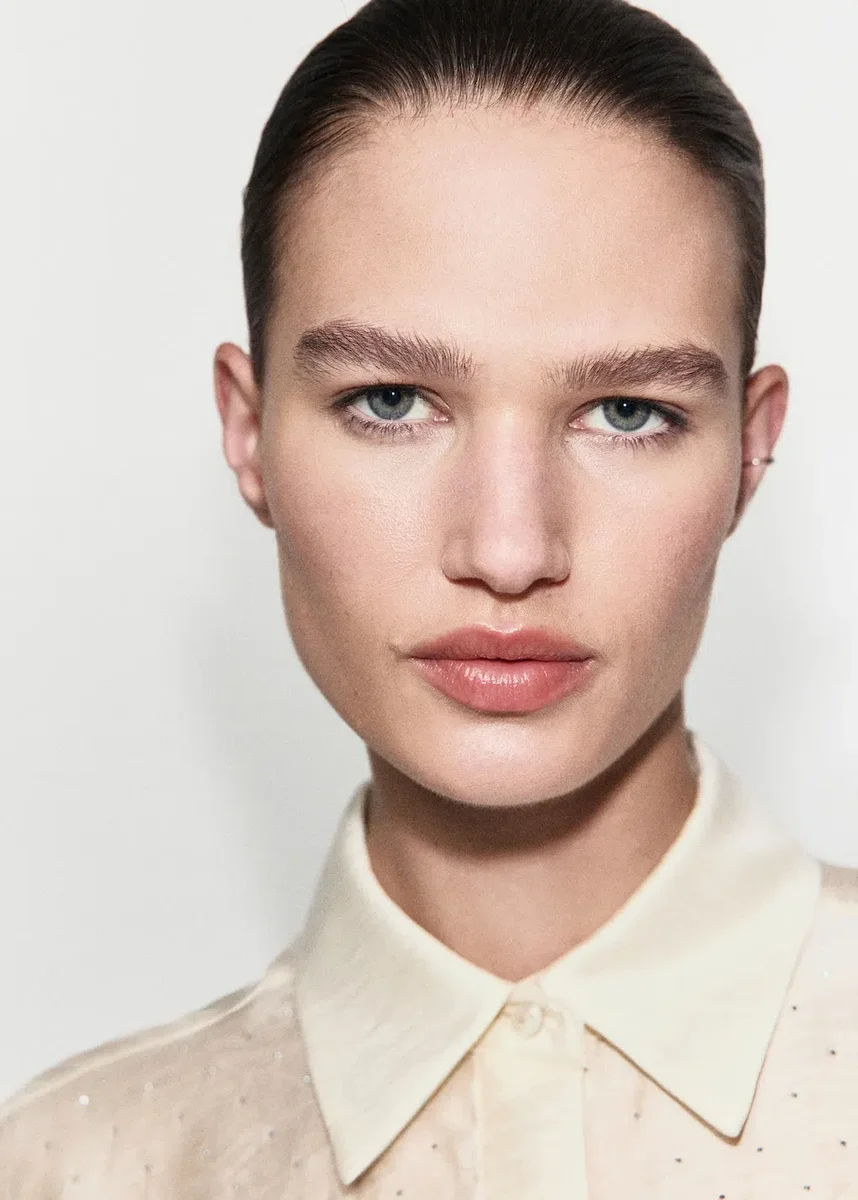 Realizzato in tessuto satinato, questo capo presenta un design dritto con dettagli in strass. Include un collo camicia e maniche lunghe con polsini abbottonati. La chiusura frontale con bottoni nascosti completa il suo stile. Disponibile in taglie forti