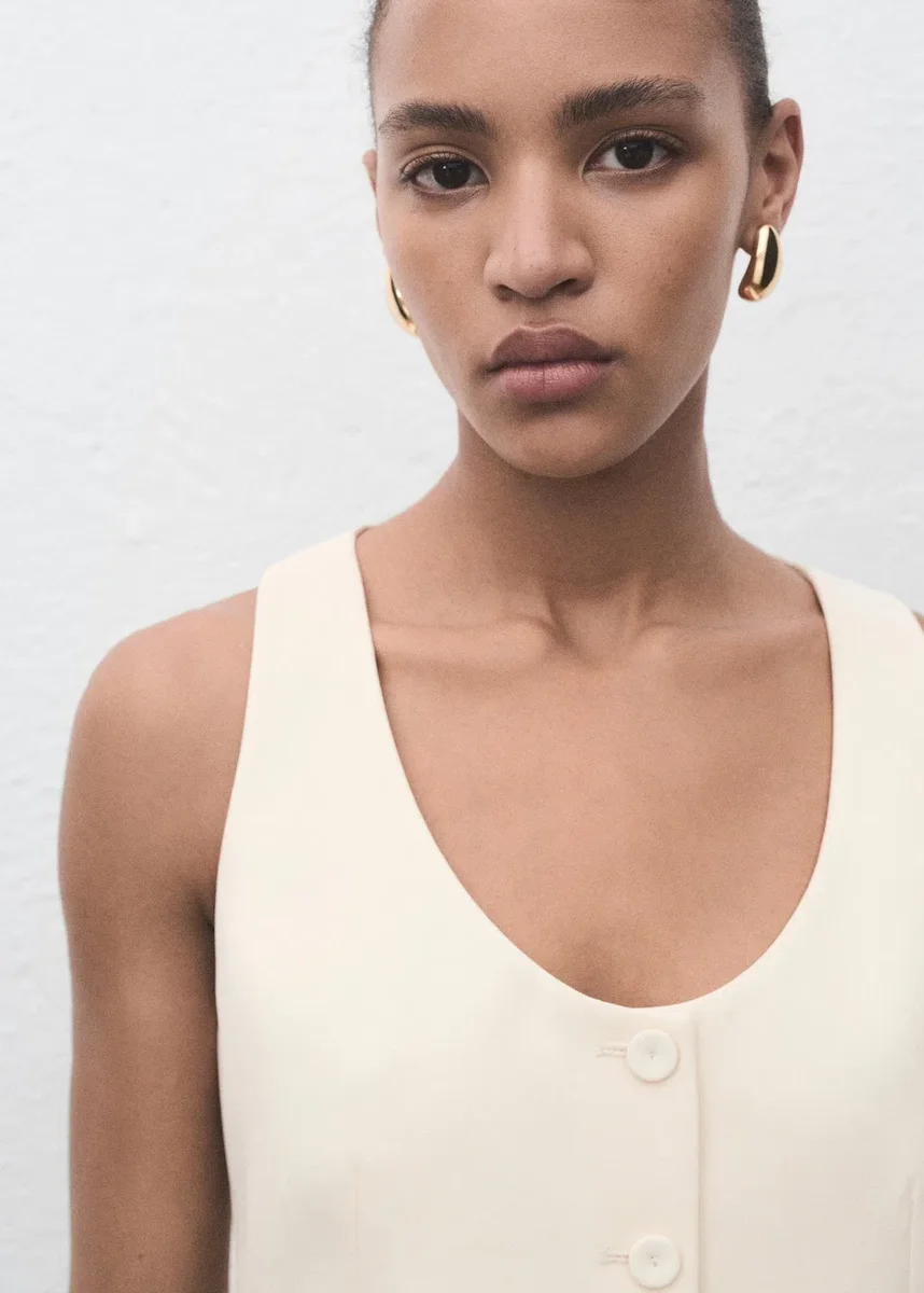 Stile giacca. Design dritto. Scollo rotondo aperto. Senza maniche. Spalline larghe. Chiusura con bottoni sul davanti. Fodera interna. Disponibile in taglie forti. Total look.