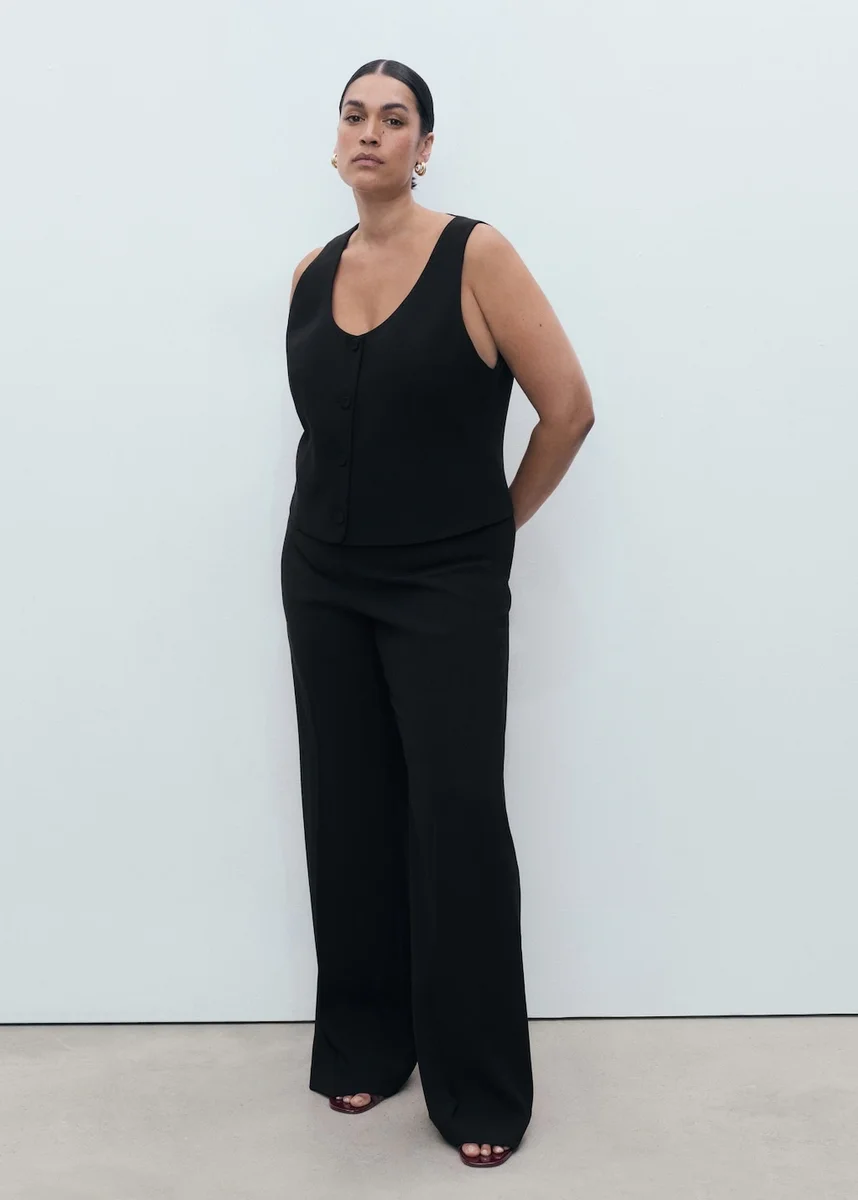 Stile giacca. Design dritto. Scollo rotondo aperto. Senza maniche. Spalline larghe. Chiusura con bottoni sul davanti. Fodera interna. Disponibile in taglie forti. Total look.