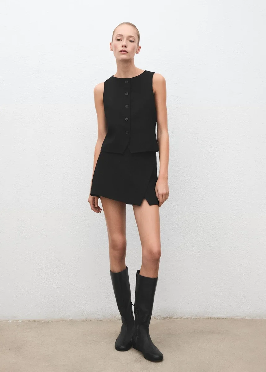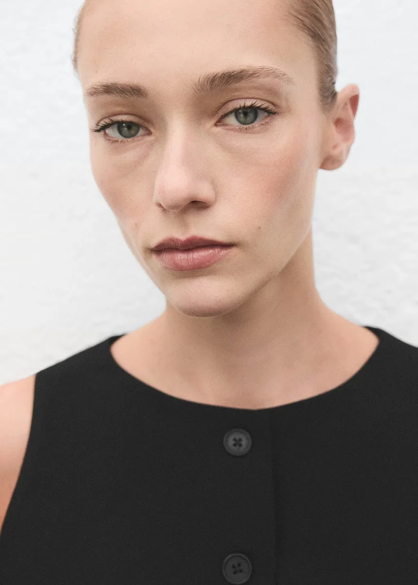 Modello dritto. Girocollo. Senza maniche. Spalline larghe. Chiusura con bottoni sul davanti. Fodera interna. Total look. Black Friday